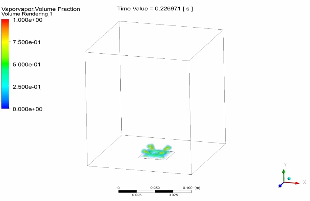 Boiling is the fast evaporation of a liquid when heated to its boiling point. The temperature at which the liquid’s vapor pressure equals the pressure exerted on the liquid by the surrounding environment. Boiling may be classified into two types: nucleate boiling, in which tiny bubbles of vapor develop at distinct places, and critical heat flux boiling, in which the boiling surface is heated above a specific critical temperature and a film of vapor forms on the surface. Transition boiling is an unstable intermediate form of boiling that has components of both forms. The boiling point of water is 100 °C or 212 °F; however, it is lower at higher altitudes due to reduced air pressure. Boiling Phenomenon and Bubble Formation CFD simulation by ANSYS Fluent is carried out in this product.