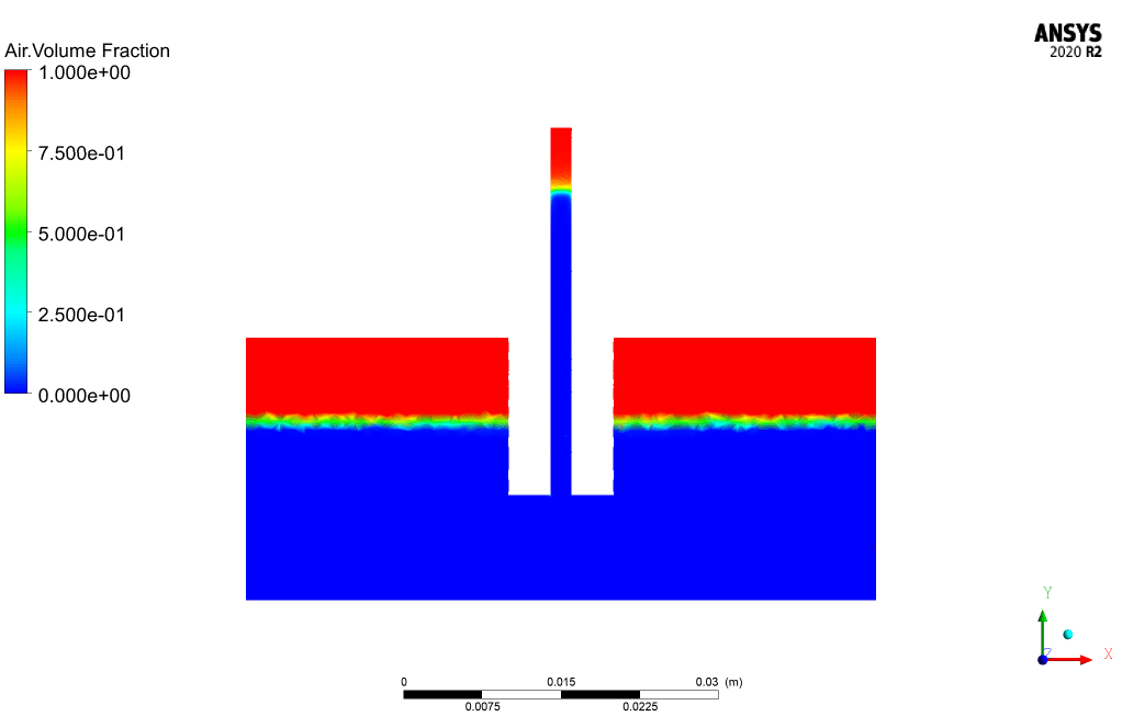 At the end of the solution process, three-dimensional velocity, air and water volume fraction, and animation are obtained. The result shows that the resident water starts to flow upward through a vessel to reach the top of the vessel due to the capillary effect.