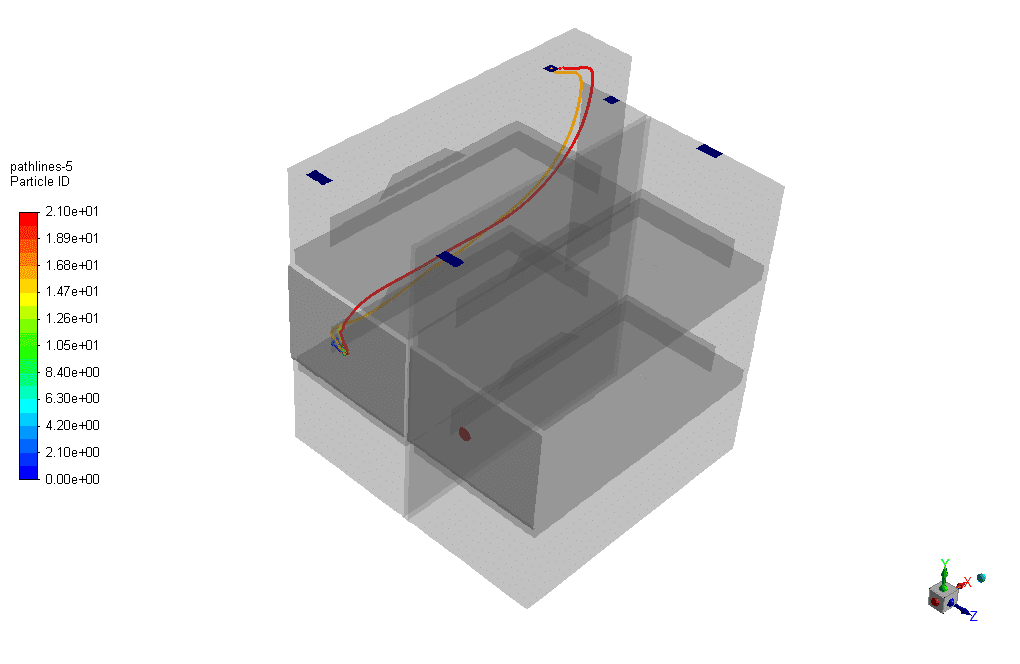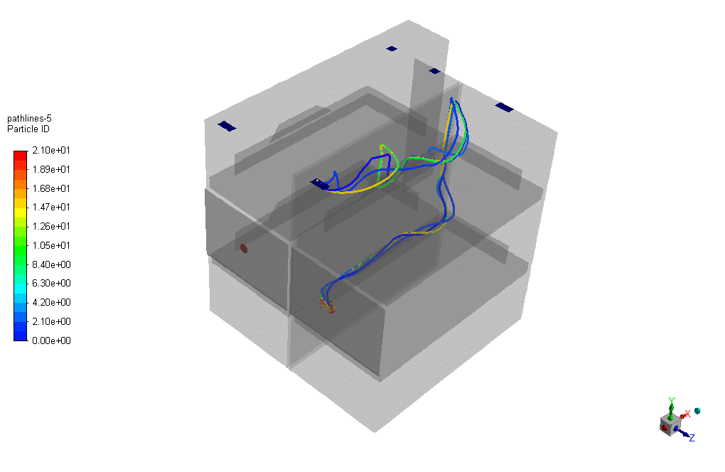 After simulation, we represent the pathline of the carbon monoxide gas exiting the exhaust car manifold. In the mentioned ventilation system, several air intake vents have been used on the roof of the stacker to eliminate environmental pollution.