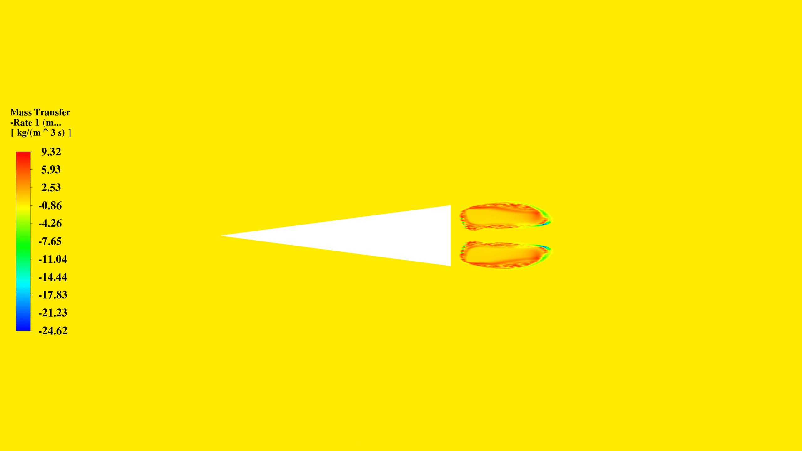 The simulation results provide valuable insights into the cavitation process and flow behavior around the triangular obstacle. The mass transfer rate contour shows significant activity behind the triangle, indicating the region where cavitation occurs. Positive values represent vaporization, while negative values indicate condensation.