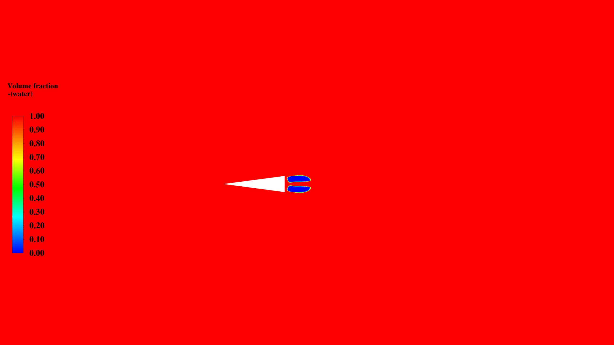 The velocity magnitude contour illustrates flow acceleration around the triangle’s edges and a low-velocity region in its wake, corresponding to the cavitation zone. The water volume fraction plot clearly shows the cavitation region, where the fraction of liquid water decreases, indicating the presence of water vapor.