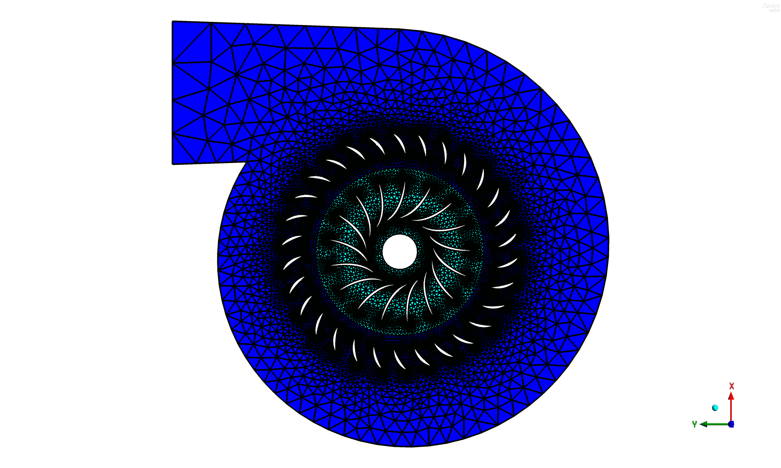 The pump geometry was developed in ANSYS SpaceClaim and consists of two distinct zones: the casing and the rotating impeller. After designing the model, it was imported into ANSYS Meshing where an unstructured triangular grid was generated to resolve the complex flow paths. The final mesh contained 17,536 triangular cells, providing adequate resolution to capture the flow behavior around the impeller blades while maintaining computational efficiency. The mesh density was kept higher near the impeller region to accurately capture velocity gradients and turbulence effects created by the rotating blades.