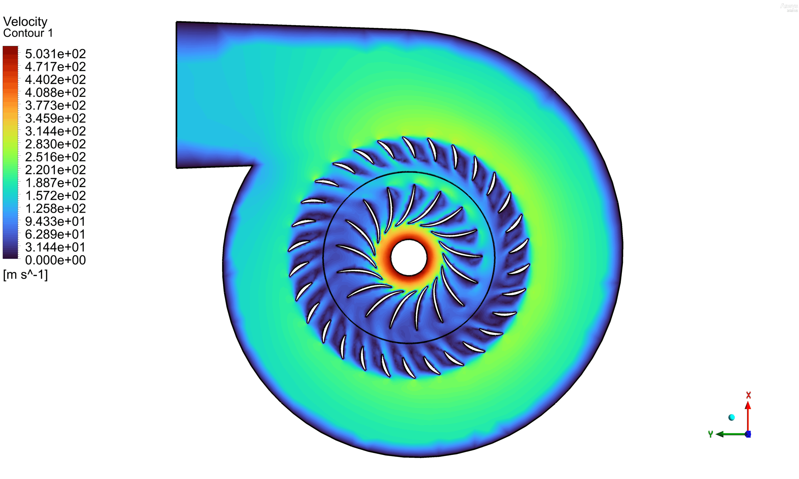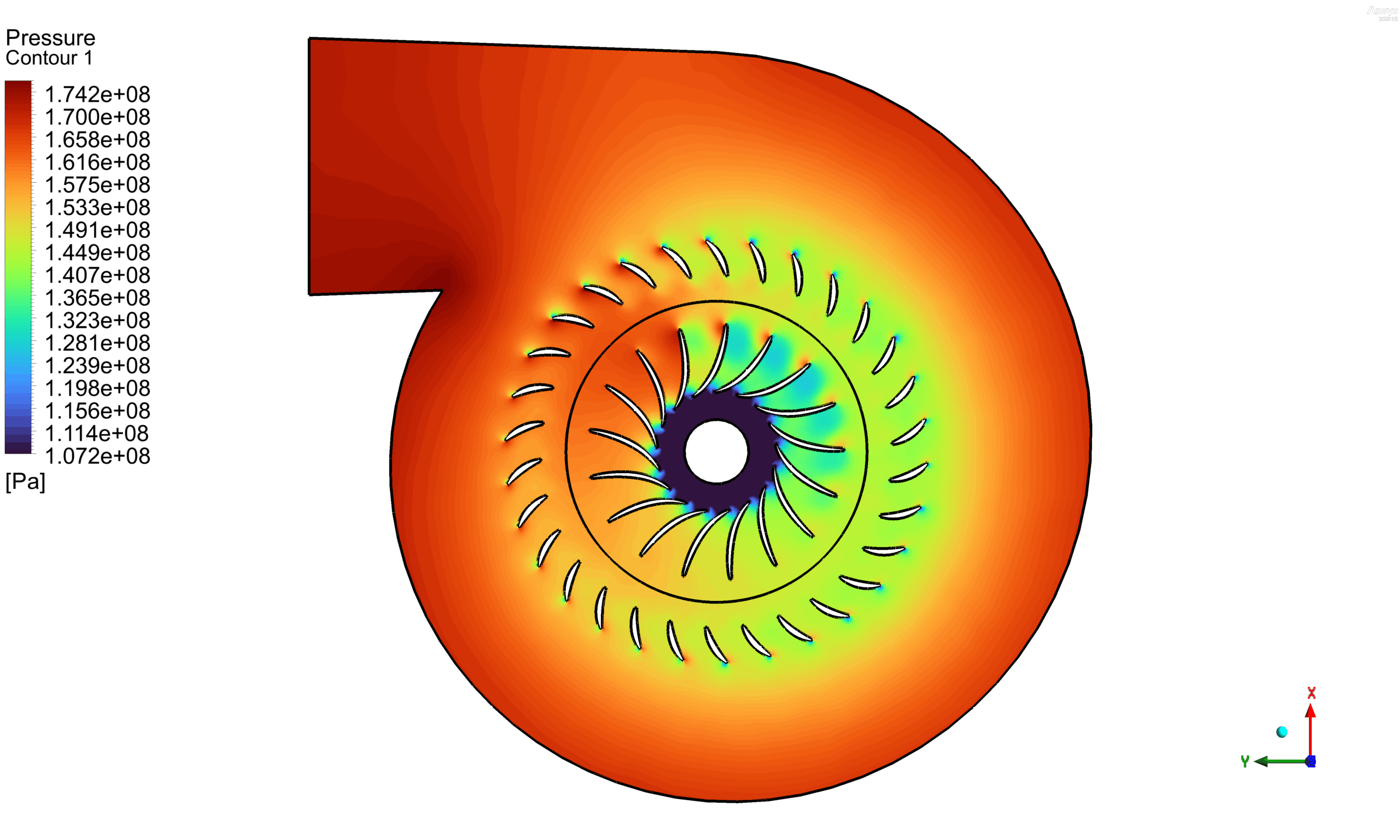 The simulation results show a clear interaction between the impeller rotation and the fluid flow, leading to both velocity rise and pressure build-up. The velocity contour indicates a strong acceleration of flow near the impeller blades, where maximum velocities reach values above 500 m/s before gradually diffusing inside the volute casing. The pressure contour reveals a significant pressure increase, with values reaching approximately 1.74 × 10⁸ Pa near the outlet regions, confirming efficient energy transfer from the impeller to the working fluid. Overall, the results capture the expected centrifugal pump behavior of converting mechanical rotational energy into increased fluid pressure and velocity, demonstrating the effectiveness of CFD in analyzing turbomachinery performance.