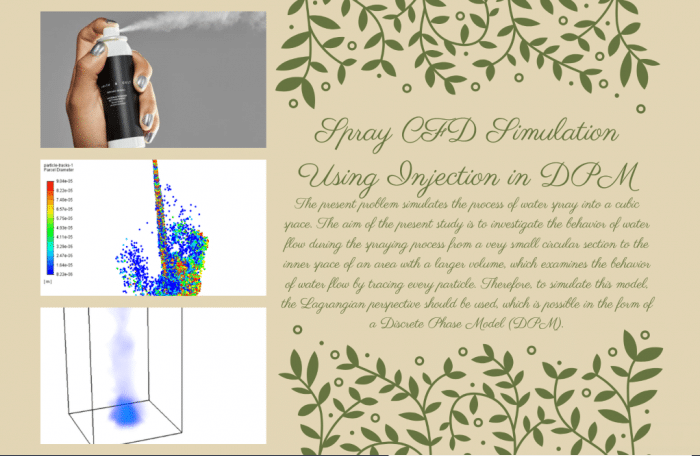 The 9th practical exercise simulates the process of water spray into a cubic space by ANSYS Fluent software. The aim of the present study is to investigate the behavior of water flow during the spraying process from a very small circular section to the inner space of an area with a larger volume, which examines the behavior of water flow by tracing every particle. Therefore, to simulate this model, the Lagrangian perspective should be used, which is possible in the form of a Discrete Phase Model (DPM).