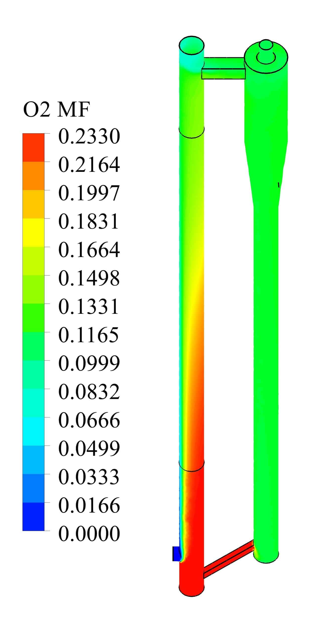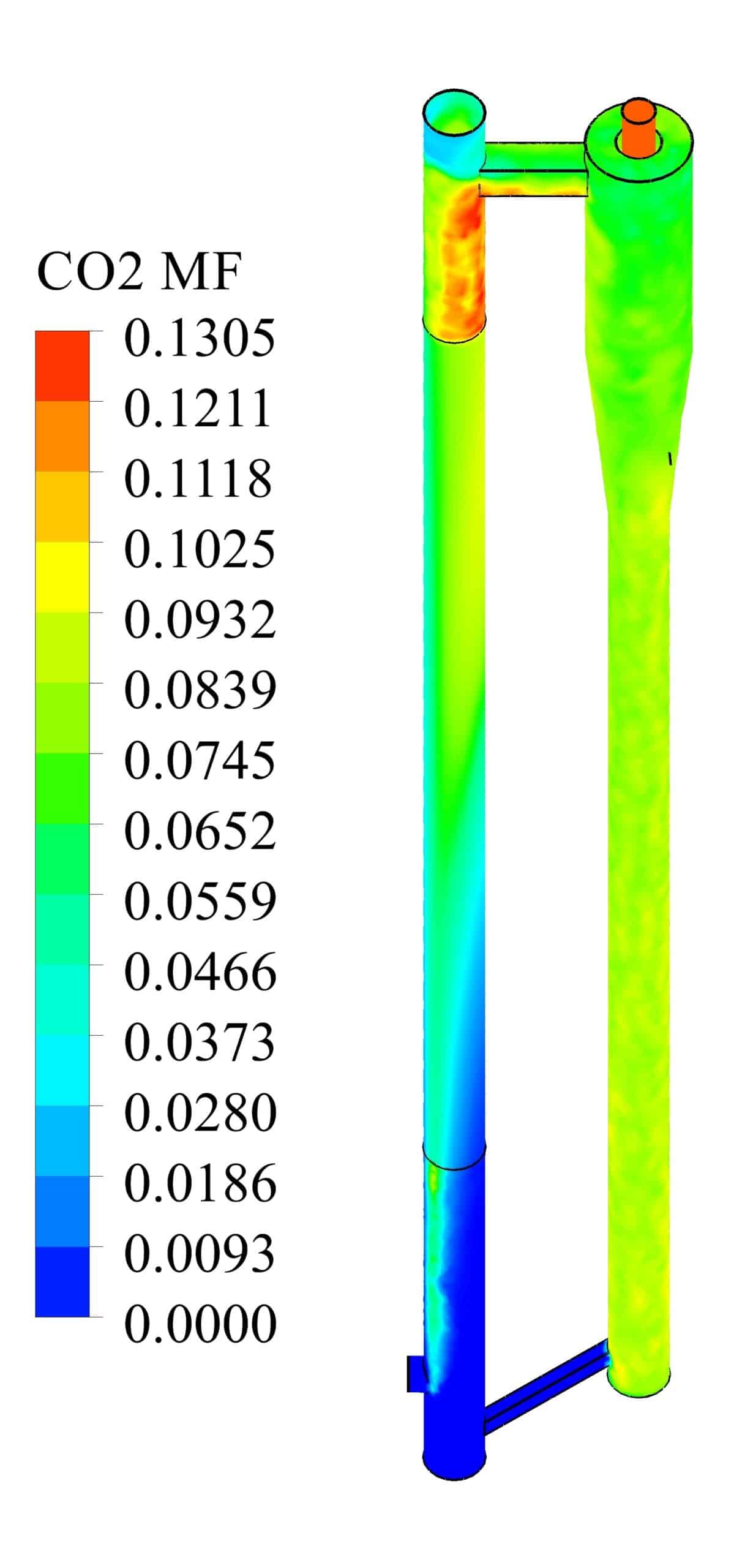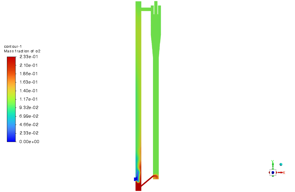 In flameless combustion, a mixture of air and fuel produces combustion without a visible flame. In the CFB gasifier simulation, the conditions for flameless combustion include a high circulating rate of the oxidizer and fuel, a sufficient temperature in the combustion chamber to initiate reactions, and the proper fuel-air mixing to ensure that combustion occurs throughout the mixture rather than in a localized flame. The setup in this CFD simulation was designed to satisfy these conditions so that efficient and complete combustion can occur, reducing pollutant emissions and maximizing fuel usage.