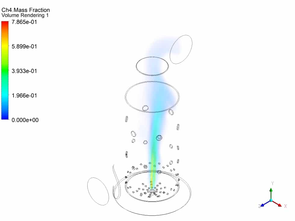 Thank you for your kind words. We used ANSYS Fluent software to model the combustion chamber as a transient problem. We applied the species transport model and the eddy dissipation concept to account for the chemical reactions and the turbulence effects. You can find more details about our simulation setup and results in our tutorial.