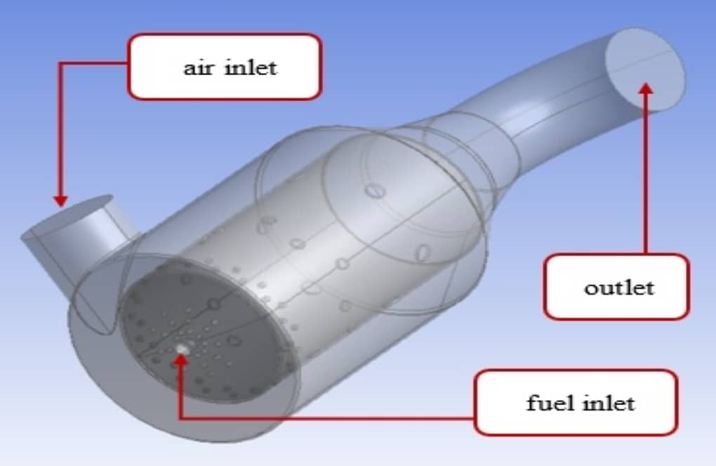 In this project, we simulate a combustion chamber by ANSYS Fluent software applying a Transient and Pressure-based solver, considering the gravity effect. Inside the combustion chamber are three main parts: the air inlet pipe, the burner section, and the outlet pipe.