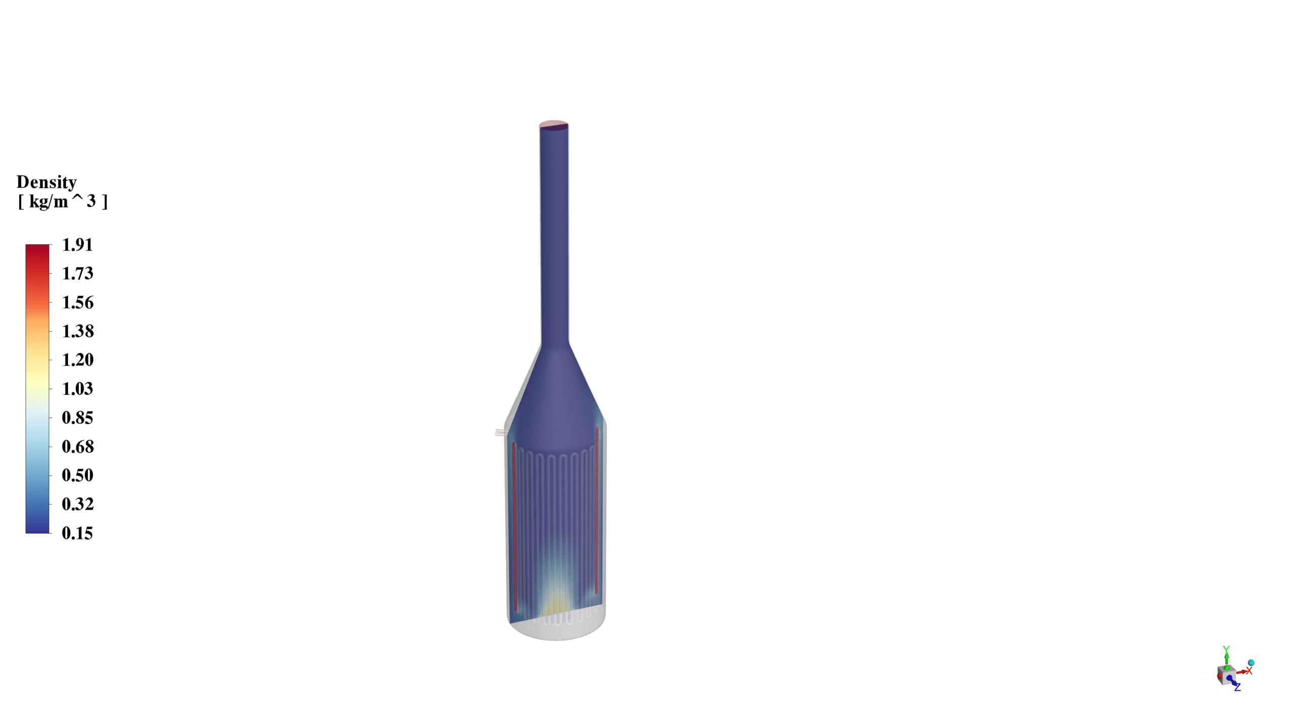 The simulation results provide valuable insights into the combustion process and species distribution within the furnace. The density contour reveals a stratified flow structure, with higher densities observed near the bottom of the furnace, likely due to the accumulation of heavier combustion products. This density gradient plays a crucial role in driving the natural convection within the furnace, influencing the overall flow patterns and mixing processes.