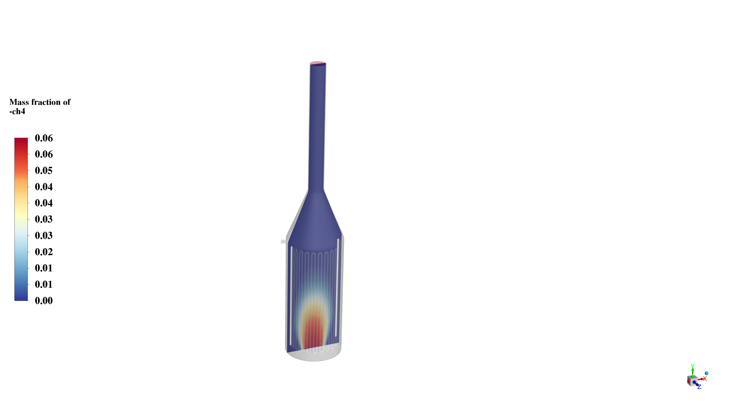 The Species Transport model was enabled to simulate the methane-air reaction, using the Eddy-Dissipation approach for turbulence-chemistry interaction.