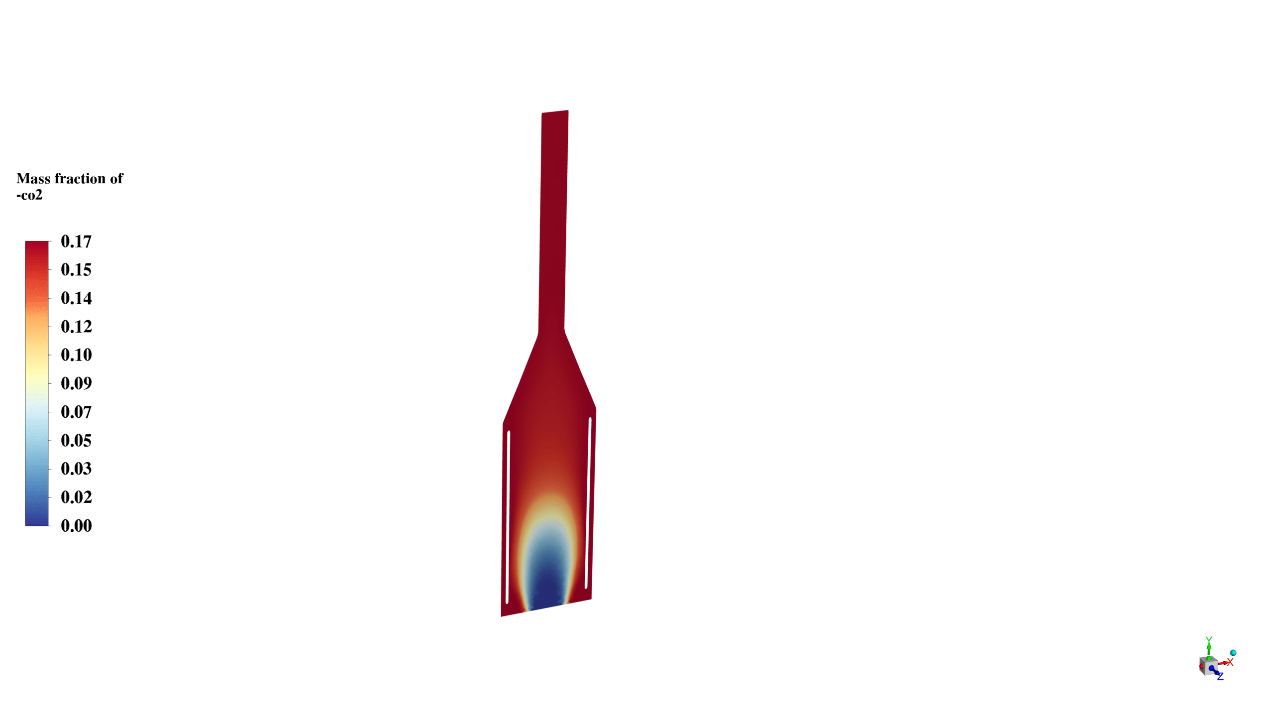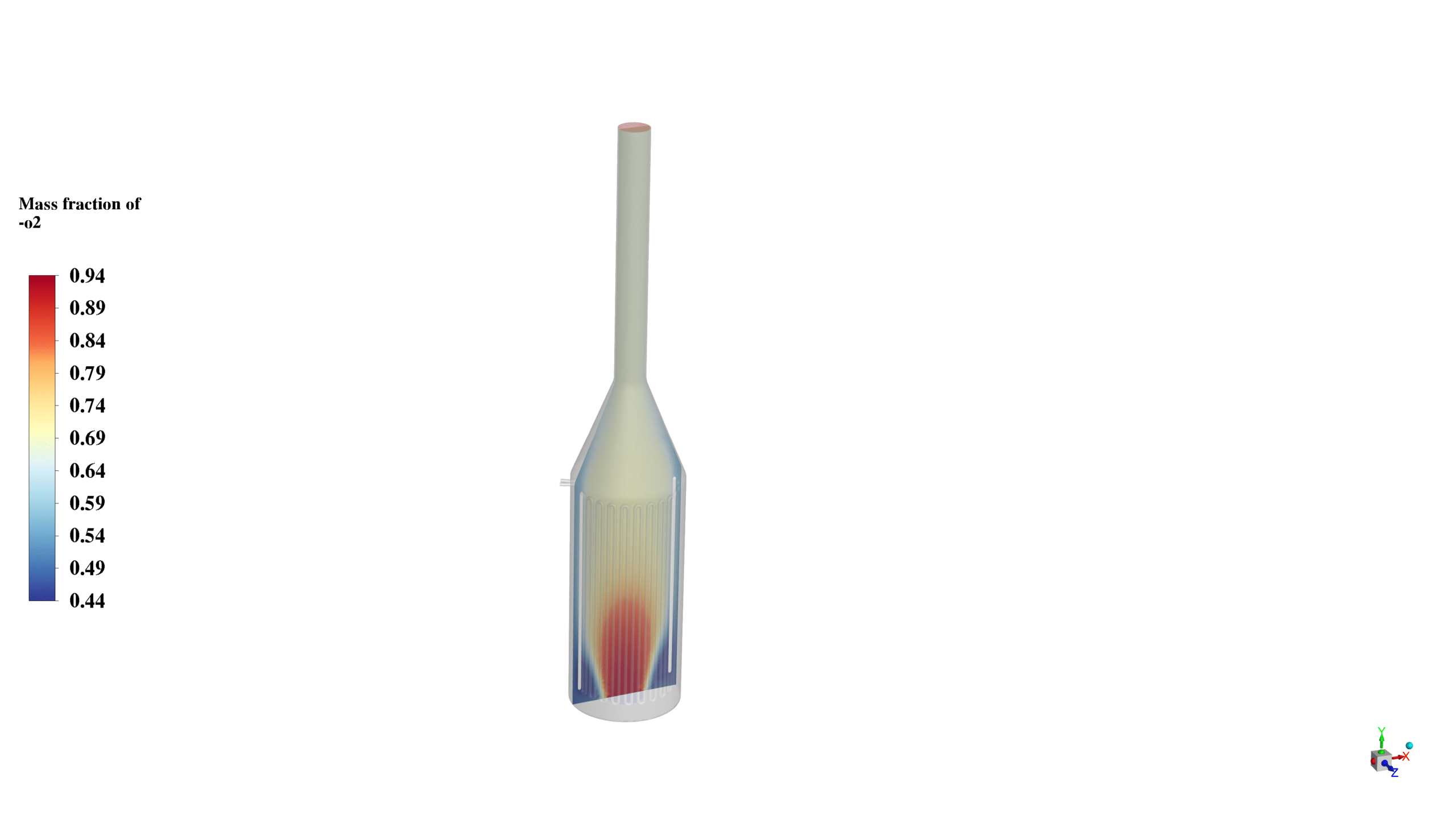 The mass fraction contours for CH4, CO2, N2, and O2 illustrate the complex interplay of reactants and products throughout the furnace. The CH4 contour shows a high concentration near the inlet, gradually decreasing as it reacts and moves upward. Conversely, the CO2 contour indicates higher concentrations in the upper regions of the furnace, consistent with the products of combustion rising due to buoyancy effects. The N2 and O2 distributions reflect the air intake and combustion processes, with O2 being consumed in the reaction zones.