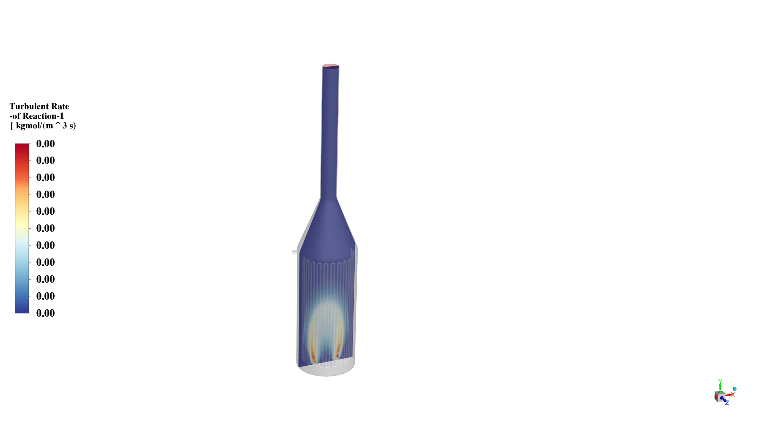 The static temperature contour reveals the thermal gradients within the furnace, with peak temperatures observed in the primary combustion zone. This temperature distribution is closely linked to the reaction rates and species concentrations, as evidenced by the turbulent reaction rate contour. The latter indicates areas of intense chemical activity, particularly near the fuel inlet where fresh reactants meet high temperatures. The velocity vectors at the inlet and outlet demonstrate the complex flow patterns within the furnace, including recirculation zones that enhance mixing and combustion efficiency. These results provide critical insights for optimizing furnace design, improving combustion efficiency, and minimizing pollutant formation.