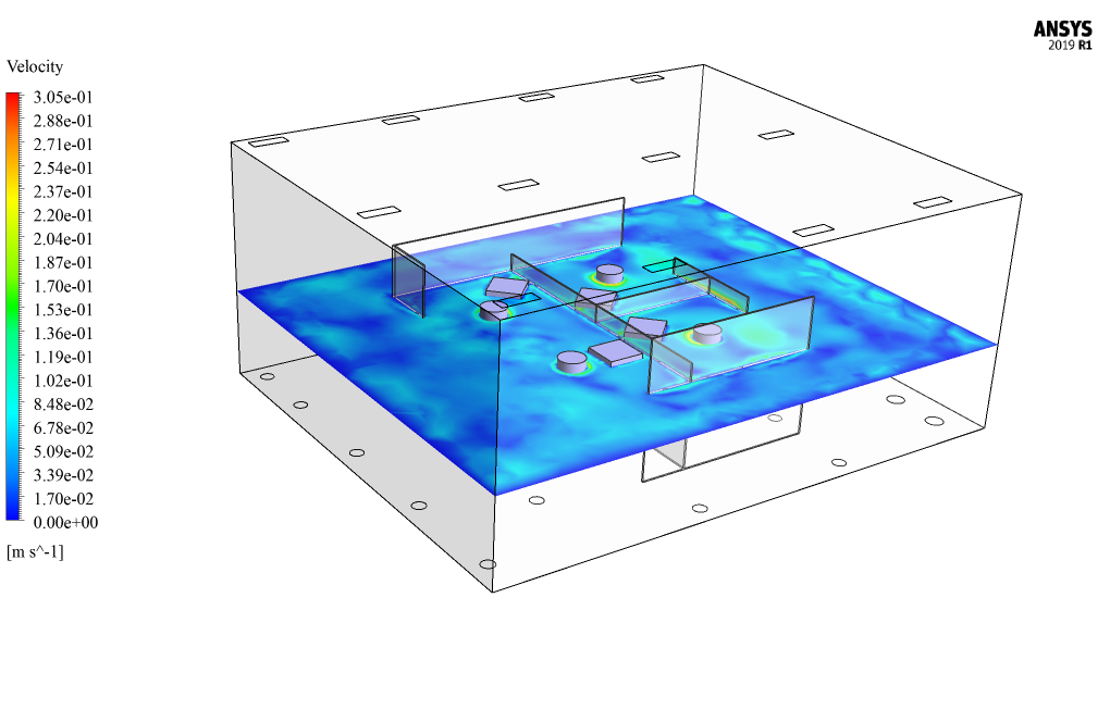 In this modeling, airflow enters the office from circular sections with a speed of 0.6125 m/s and a temperature of 291.1 K. It exits through rectangular sections on the office roof with a pressure equal to atmospheric pressure.