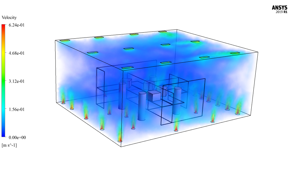 The present problem simulates air conditioning in an office with several computers and simulators using ANSYS Fluent software. The air conditioning system in the current model is of floor heating and ceiling cooling. In these systems, the buoyancy effect causes free heat transfer inside the office space.