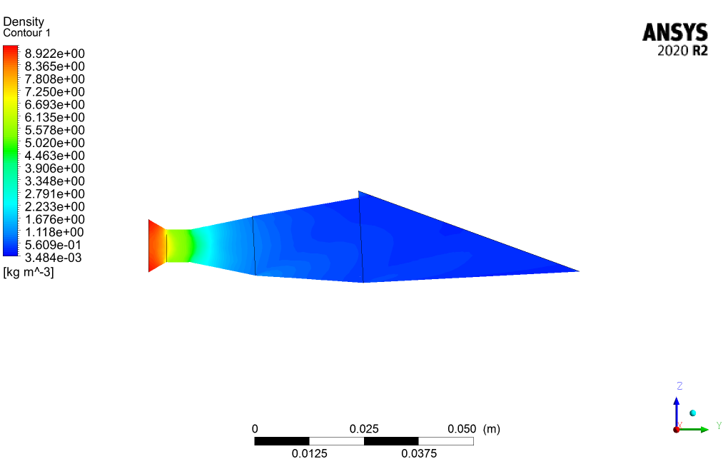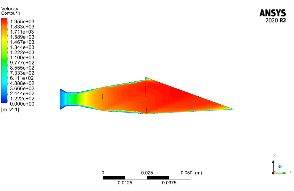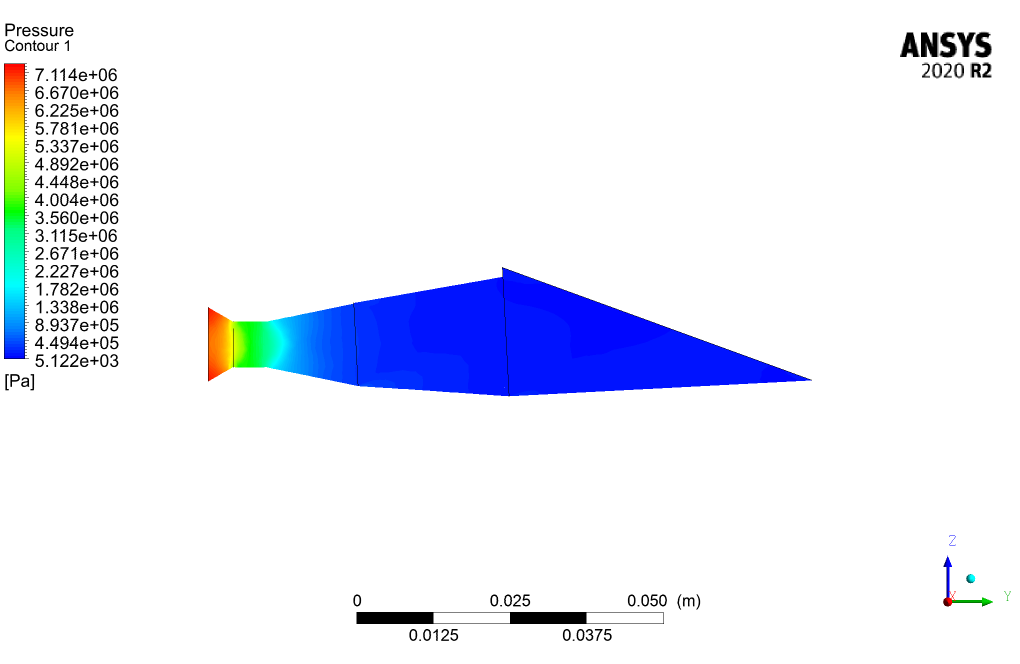 Due to the constant air mass, its density decreases, so according to the continuity law, the velocity increases along with the nozzle. As seen from the Mach contour, the Mach number in the nozzle throat, according to the design mode, is equal to one and then increases in the nozzle’s divergent part.