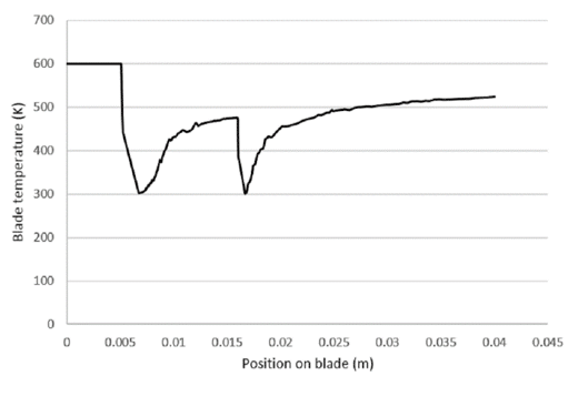 Furthermore, it can be observed in temperature contour and changes of blade temperature in terms of blade position diagram that the lateral inlets have effectively done their job and lowered the temperature of the blade’s surface, as the free stream has a temperature of 600 K and the blade’s final temperature is less than 520 K.