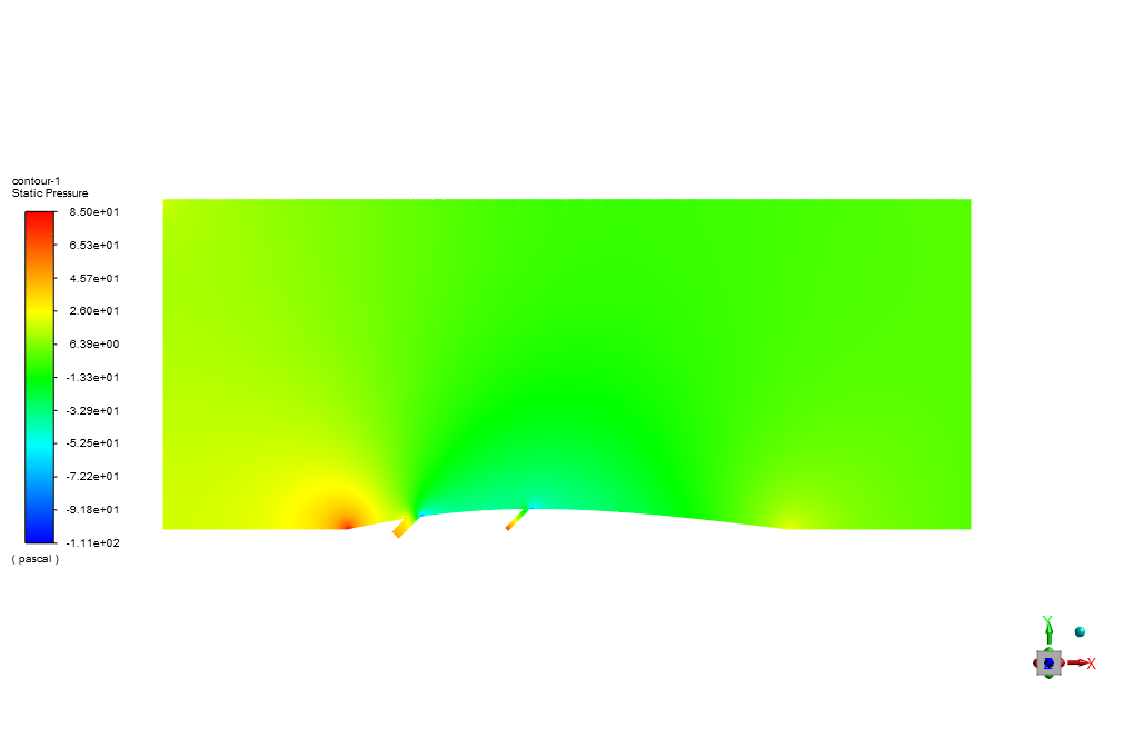 At the end of the solution process, we obtain two-dimensional contours related to pressure, velocity, and temperature. For instance, the temperature reduction near the airfoil’s surface is evident due to the injection of cold airflow.