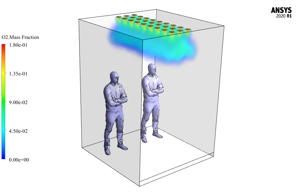 We also export the animation of the virus dispersion and its disappearance over time and attached it to the project report file. Finally, we obtain three-dimensional contours related to the temperature and mass fraction of oxygen released from the ventilation system and water droplets secreted from the cough.