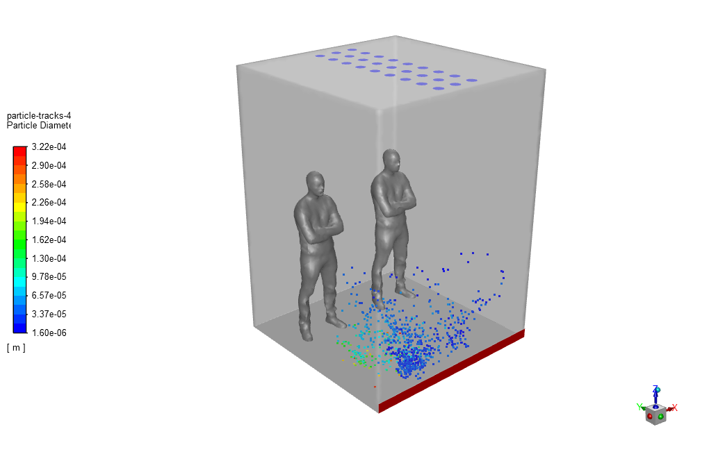 At the end of the solution process, we obtain the virus particle tracking at the last second of the simulation process. This particle tracking is based on residence time and particle diameter size.