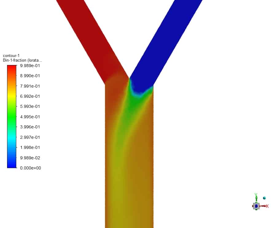 This project presents a numerical simulation of the crystallization process of Loratadine in a dual-inlet nozzle using the Population Balance Model (PBM) in ANSYS Fluent. The main objective is to study the particle size distribution and the effects of mixing on crystal formation during the interaction of ethanol and water streams. These fluids mix to create supersaturation conditions that lead to nucleation and growth of Loratadine crystals. The simulation provides useful insights into the relationship between hydrodynamics, turbulence, and crystallization kinetics, helping to improve the design and control of similar industrial processes.