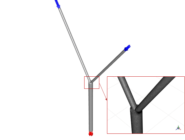 The computational domain represents a dual-inlet nozzle where ethanol and water enter through separate inlets and mix before exiting through a single outlet. The geometry was created in ANSYS DesignModeler, and the mesh was generated using ANSYS Meshing. A tetrahedral mesh was applied to capture the complex flow behavior inside the nozzle, with refinement in the mixing region to improve accuracy. The total number of elements was 506,677, ensuring an adequate balance between accuracy and computational cost. The mesh quality was verified to maintain low skewness and ensure stable convergence during the simulation.