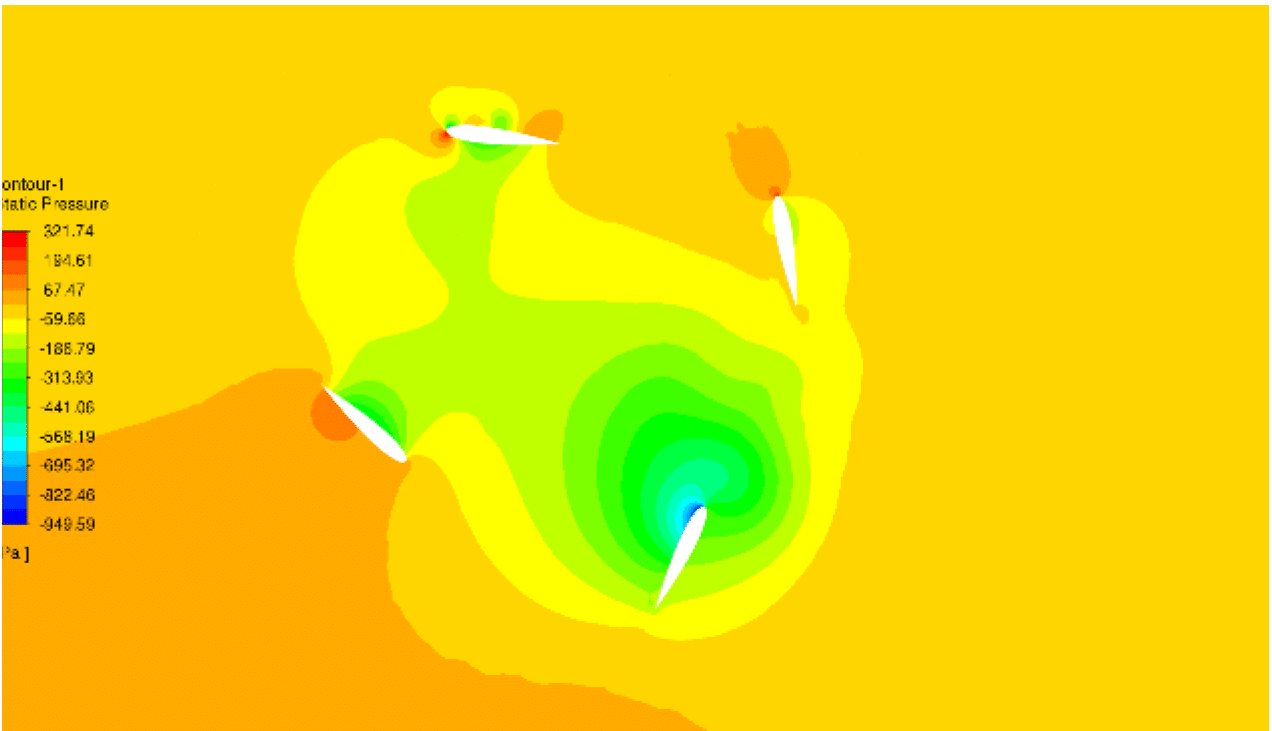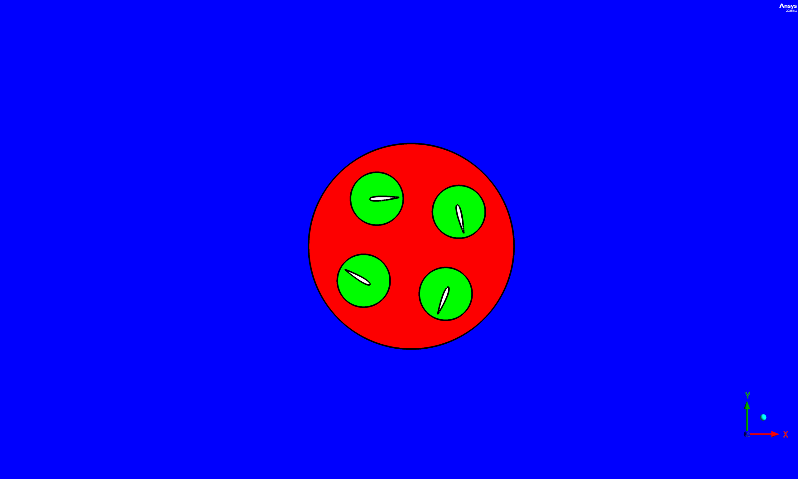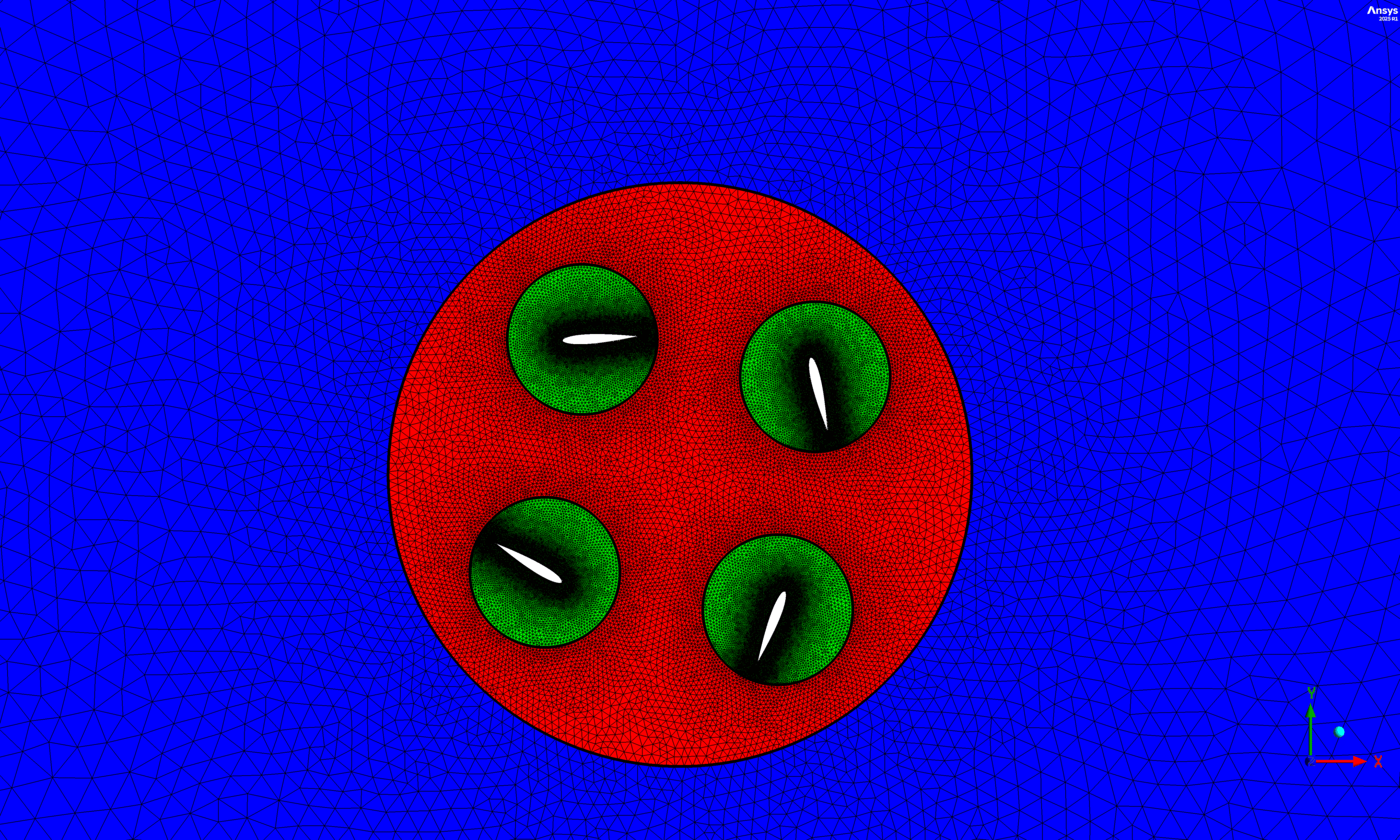 The rotor is equipped with four identical blades with a NACA 0015 airfoil section. Each blade of Cycloidal Rotor has a chord length of 1 m and rotates about a pitch axis located at 0.25 of the chord. The blades are mounted on a circular rotor placed inside a larger outer domain that represents the surrounding flow field. To provide good control over the grid resolution and allow for blade motion, the computational domain is divided into six fluid zones: four local cylindrical zones surrounding each blade, one circular rotor zone encompassing the four blade zones, and one outer stationary far-field domain. The geometry of Cycloidal Rotor created in DesignModeler and discretized in ANSYS Meshing with an unstructured tetrahedral mesh refined around the airfoils and in the near wake region. The final grid contains 169,277 cells, with a higher density near the blade surfaces and in the interface regions between zones, to accurately capture the large pressure and velocity gradients.