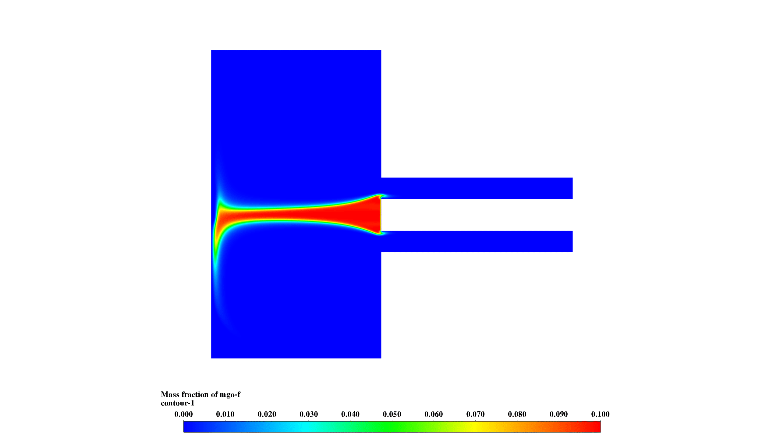 - MgO-f mass fraction (0-0.1) peaks in the central chamber, showing product formation and transport.