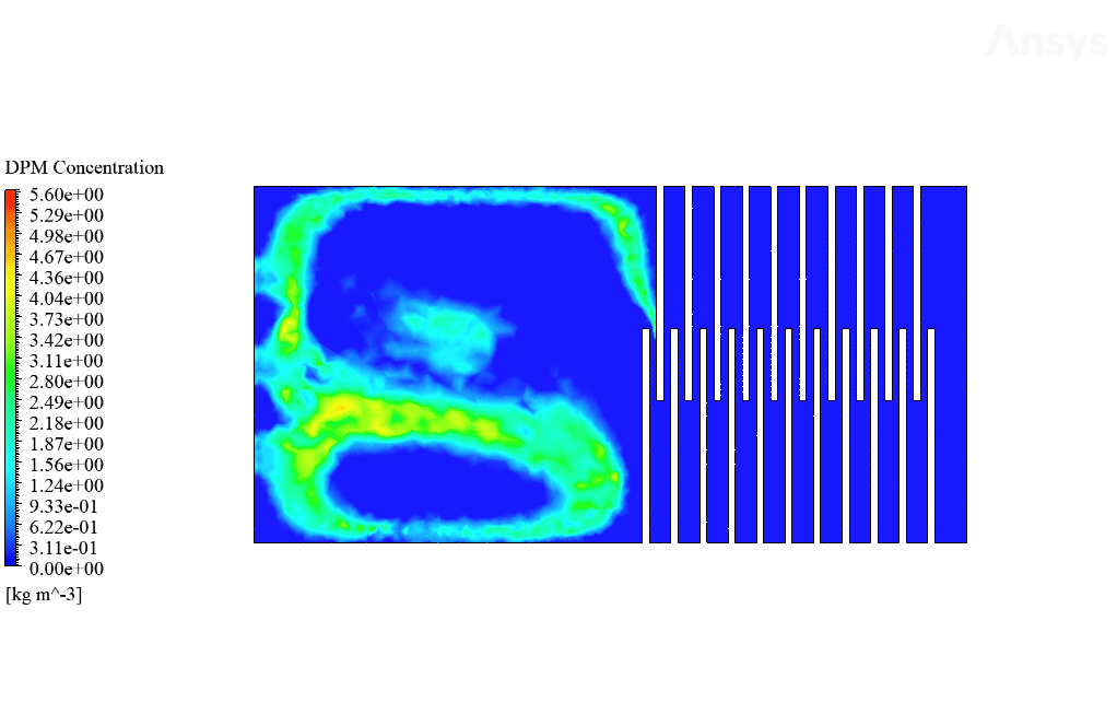 After calculation, 2D and 3D contours related to velocity, pressure, pressure gradient, and DPM concentration are obtained. The particle tracks based on residence time are also shown. The results show that the fluid flow passes through a tortuous path through the space between the plates and is in constant contact with the surface of the plates.