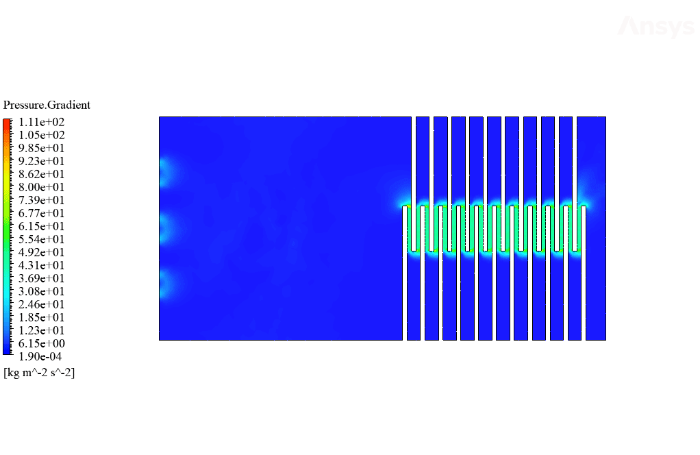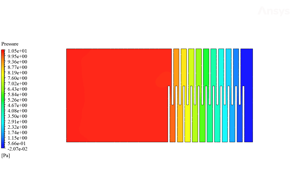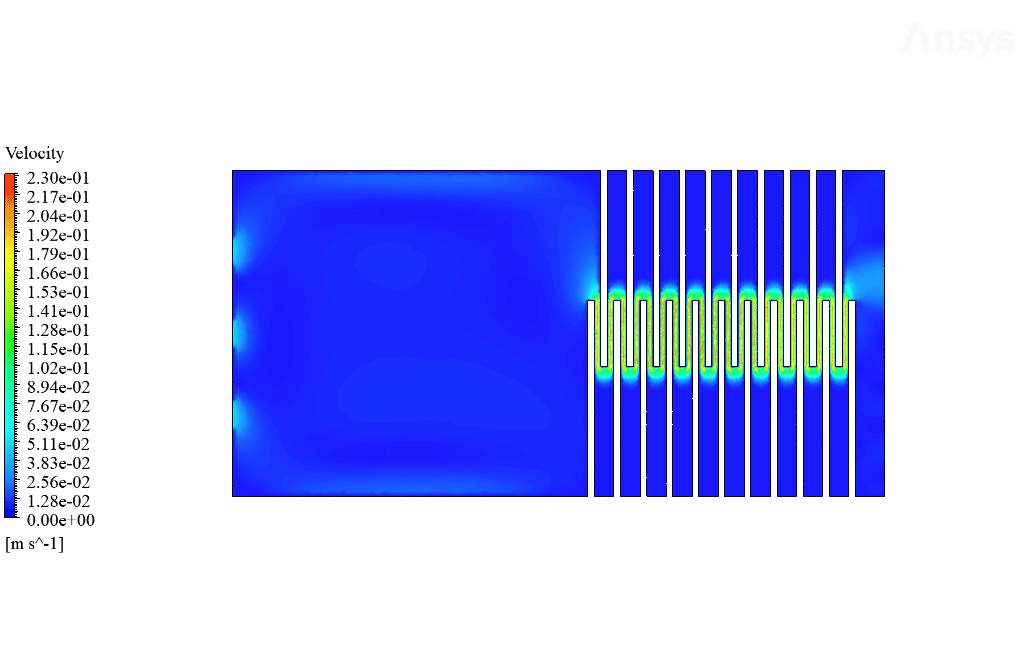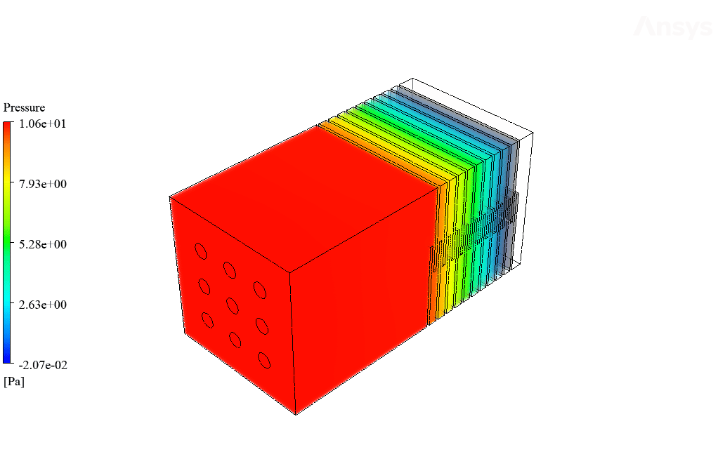 The present geometry is designed in a 3D model via Design Modeler. The computational zone is the interior of a dehumidifier. Inside the chamber, 21 rows of plates are designed as obstacles perpendicular to the fluid flow path.