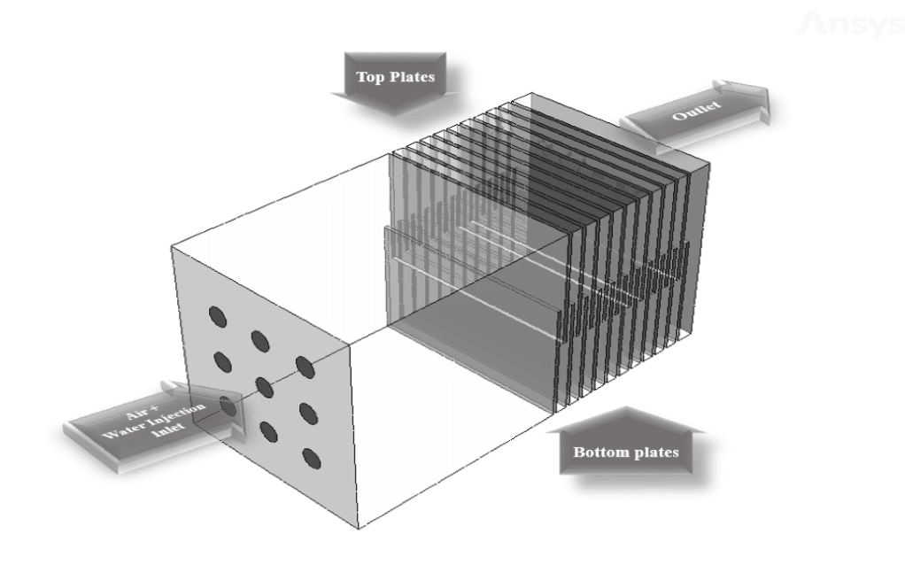 Ten plates are connected to the upper level of the chamber, and eleven plates are connected to the lower level of the chamber and are placed in the middle with one arrangement. The air inlet is from the chamber’s left side, and nine separate vents are defined as the center for spraying water with discrete particles.