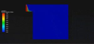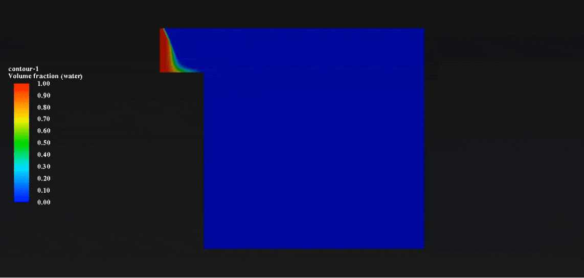 After that, the time step size is equal to 0.02 seconds. So the flow time goes for 4 seconds. ‌This plot correctly shows this time step increase. That is, from the 5th second, the gradient of the flow time increases. We also obtained some contours to show the filling of the water tank. So, we obtained the contours of air and water volume fractions at different simulation times.