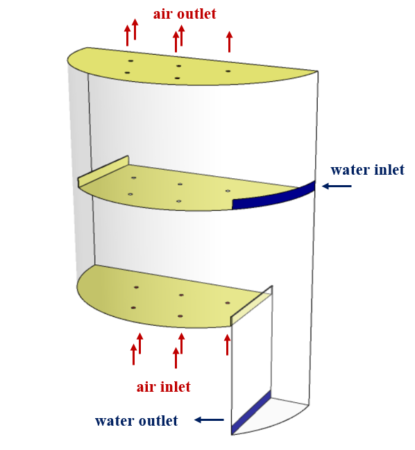 The flow of pure air travels upwards through five small circular holes embedded in the lower part of the chamber at a speed of 23.35 m.s-1 and exits through five open-facing holes at the top of the chamber; While the flow of pure water with a mass flow rate of 4 kg.s-1 enters the chamber through a side hole and exits through a hole embedded in the bottom of the model by moving downwards. The place for the two-phase contact is a tray modeled in the middle of the tower enclosure, which consists of five circular holes on its surface and water flows through it.