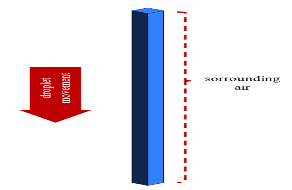 In this problem, a water droplet falling in the air is simulated by ANSYS Fluent software. Therefore, the two-phase flow model is used to simulate the initial air phase and the secondary water phase. This simulation only includes fluid analysis and does not discuss thermal analysis. The purpose of the simulation is to investigate the drop behavior during a downward slope and the extent of its volume changes. No external factor as a boundary condition affects the droplet, and the downward movement is based solely on the force of gravity. The time taken to process the downward movement of water droplet within the air space is assumed to be 0.26 seconds.