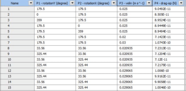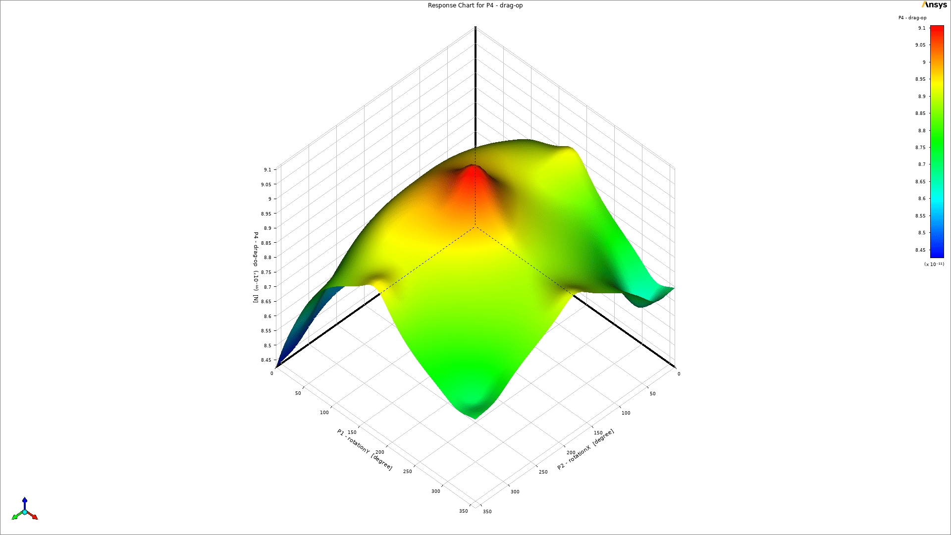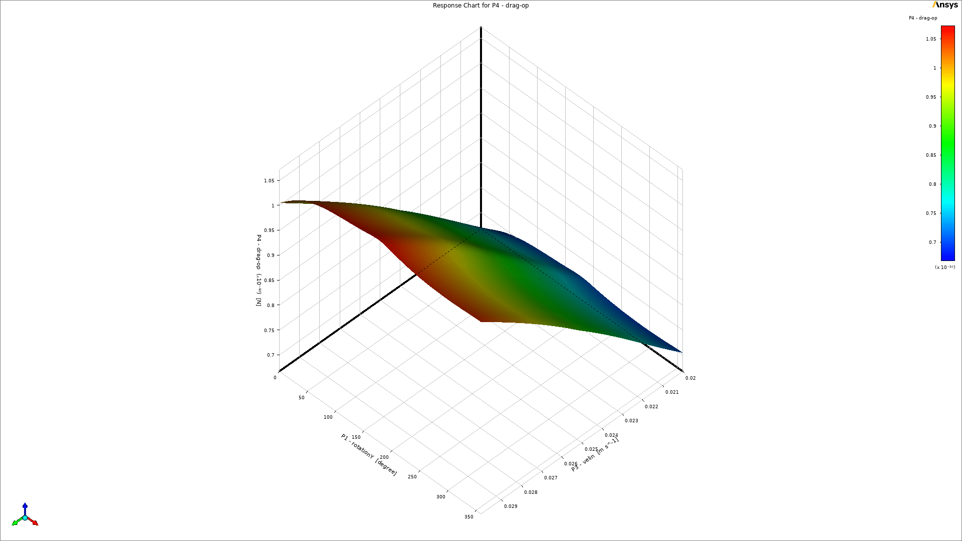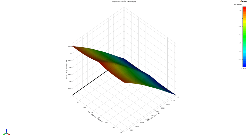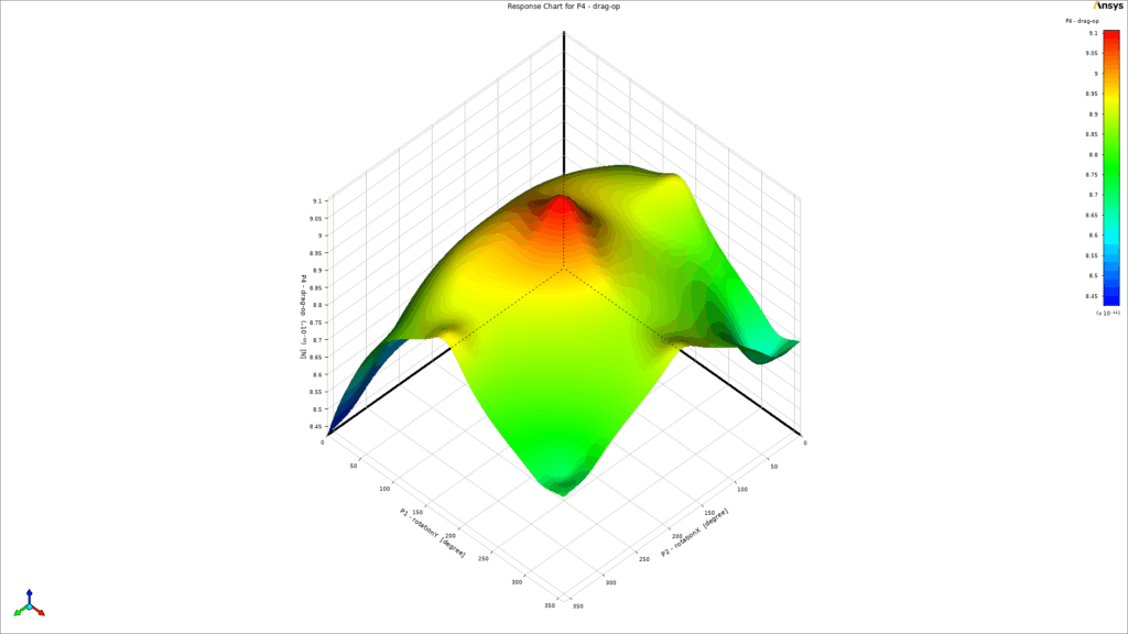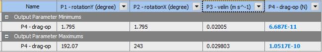 As a key part of the post-processing step, 3-dimensional response surfaces are depicted in Figure 5. They can be very helpful to get a general idea about each parameter`s distribution. To get into more details, 2D plots are extracted (Fig.6). It is clear that the inlet velocity magnitude is the most influential parameter on the drag force acting on the object, and there is a direct relation between them. On the other side, the impact of rotation about the Y-axis could be more effective than rotation about the X-axis (Fig.6d). Therefore, we need to consider all 3 input parameters at the same time to get to the maximum and minimum value of drag force. Thanks to the DOE method of Ansys Workbench, the final report has shown 6.687e-11 and 1.0517e-10 as the minimum and maximum value of drag force, respectively. Figure 7 clearly shows that they had taken place.
