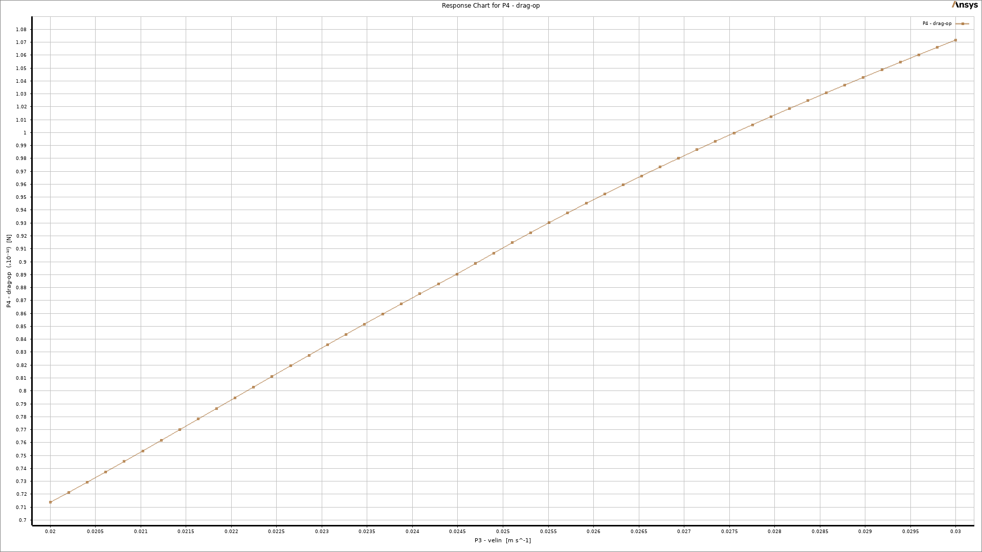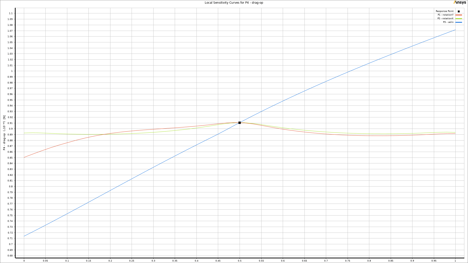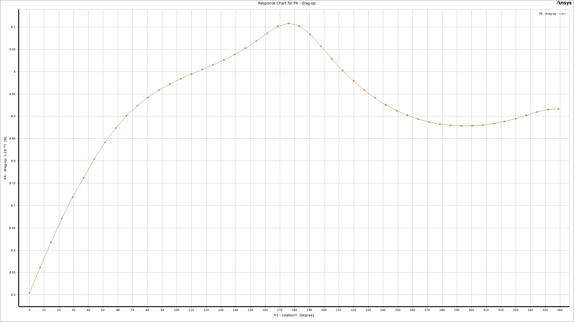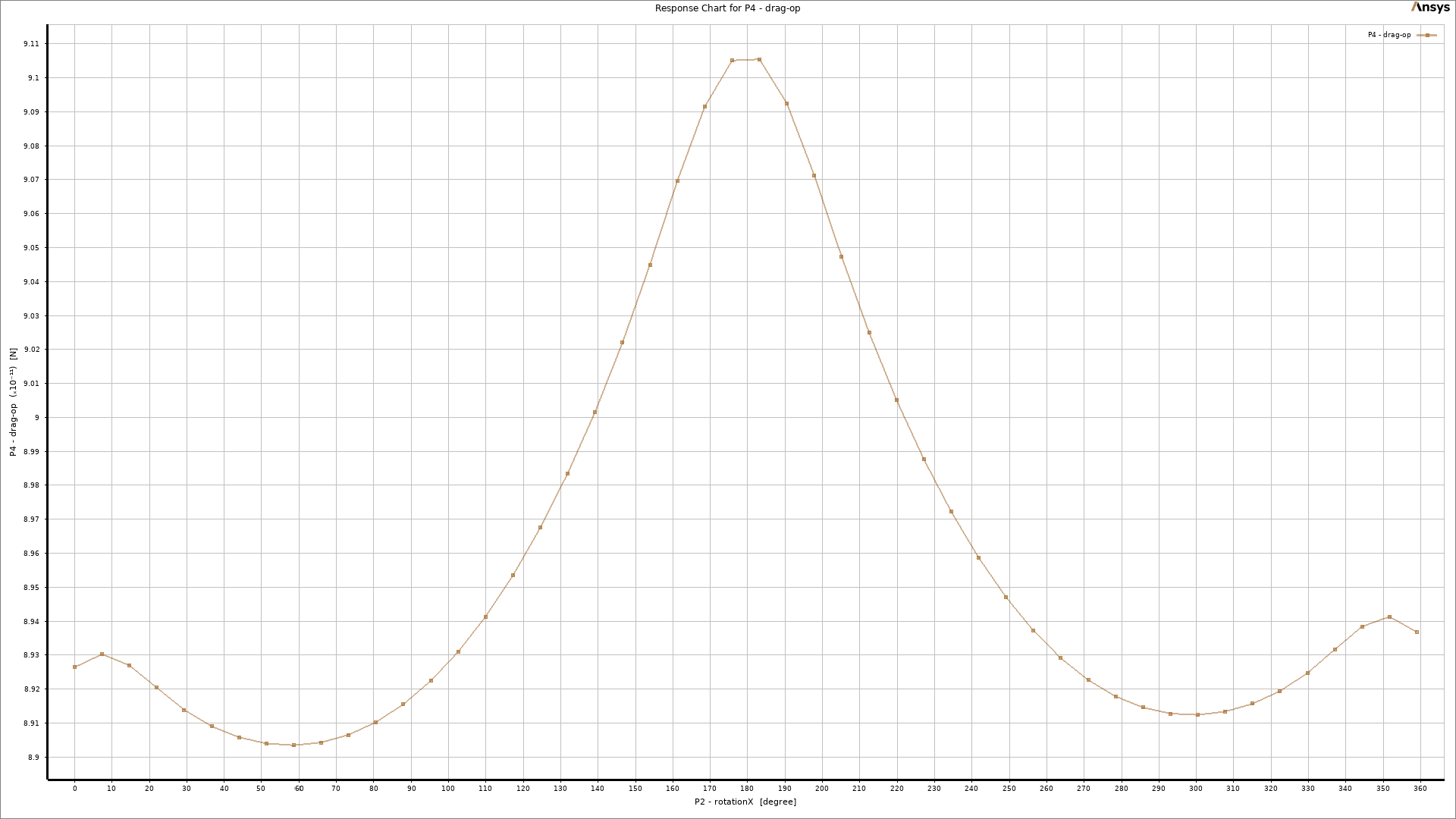 As a key part of the post-processing step, 3-dimensional response surfaces are depicted in Figure 5. They can be very helpful to get a general idea about each parameter`s distribution. To get into more details, 2D plots are extracted (Fig.6). It is clear that the inlet velocity magnitude is the most influential parameter on the drag force acting on the object, and there is a direct relation between them. On the other side, the impact of rotation about the Y-axis could be more effective than rotation about the X-axis (Fig.6d). Therefore, we need to consider all 3 input parameters at the same time to get to the maximum and minimum value of drag force. Thanks to the DOE method of Ansys Workbench, the final report has shown 6.687e-11 and 1.0517e-10 as the minimum and maximum value of drag force, respectively. Figure 7 clearly shows that they had taken place.