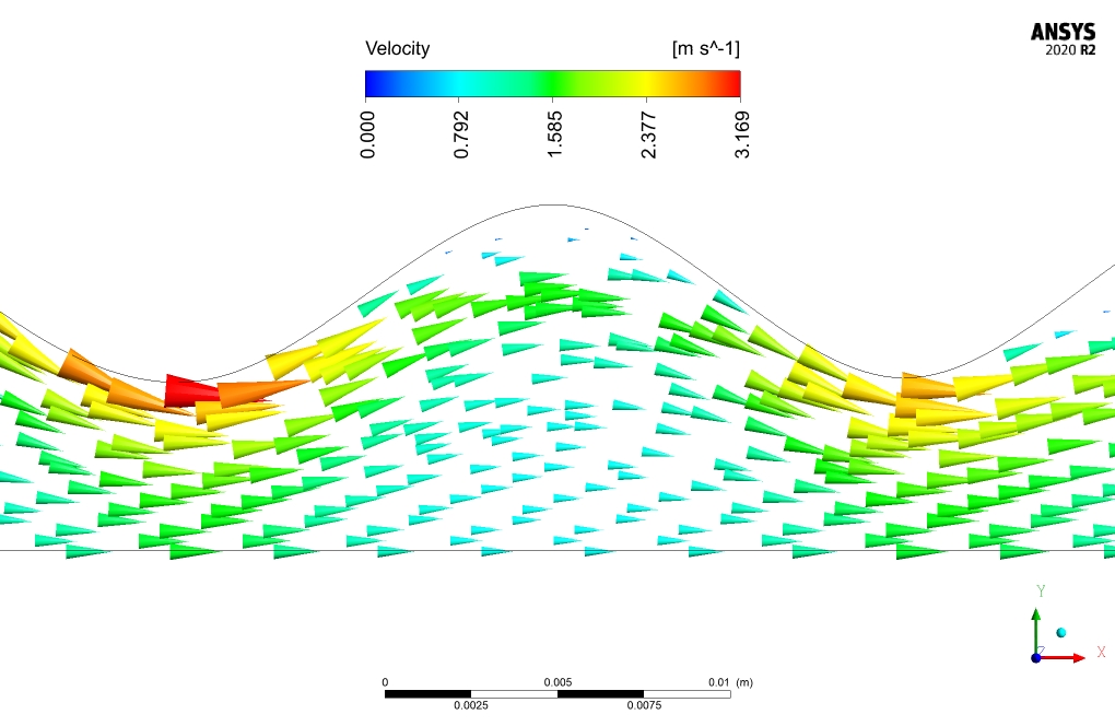 In this project, nanofluid flows in a bumpy channel in the presence of an applied electrical potential applying ANSYS Fluent software. Fluid flow is steady and is simulated as one single-phase flow, however, the thermophysical properties of nanofluid are modified. The electrical characteristics of nanofluid alter the fluid mechanics behavior of flow which results in heat transfer increase. The surface average of the nanofluid’s temperature is equal to 300 and 301.926K at the inlet and outlet respectively.
