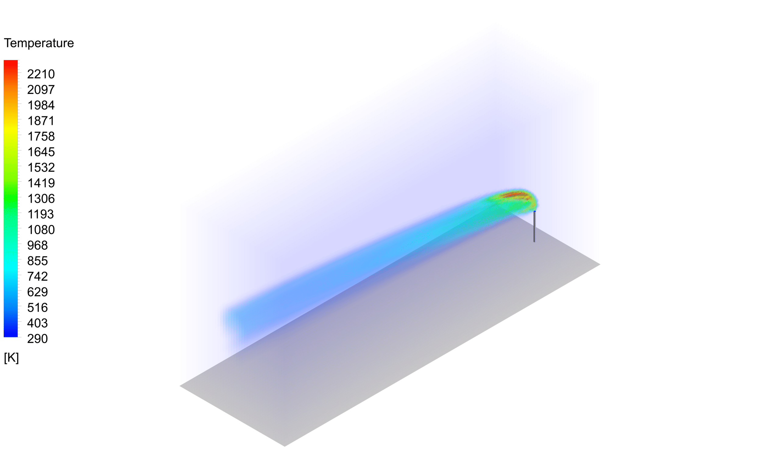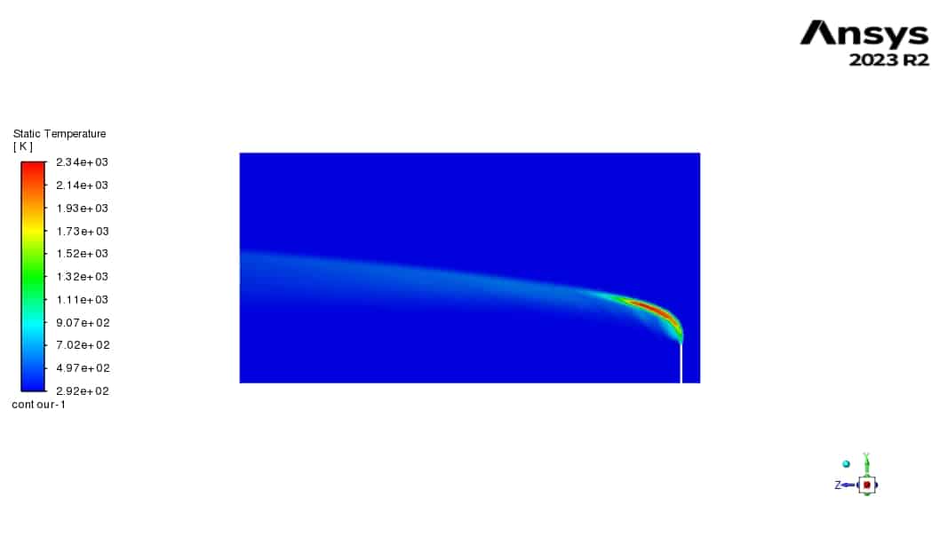 - Flare Outlet Velocity and Temperature: The velocity contours at the flare outlet, depicts the high-velocity jet of wood gas being released into the atmosphere. The temperature contours, indicates the elevated temperatures of the wood gas as it exits the flare mouth.