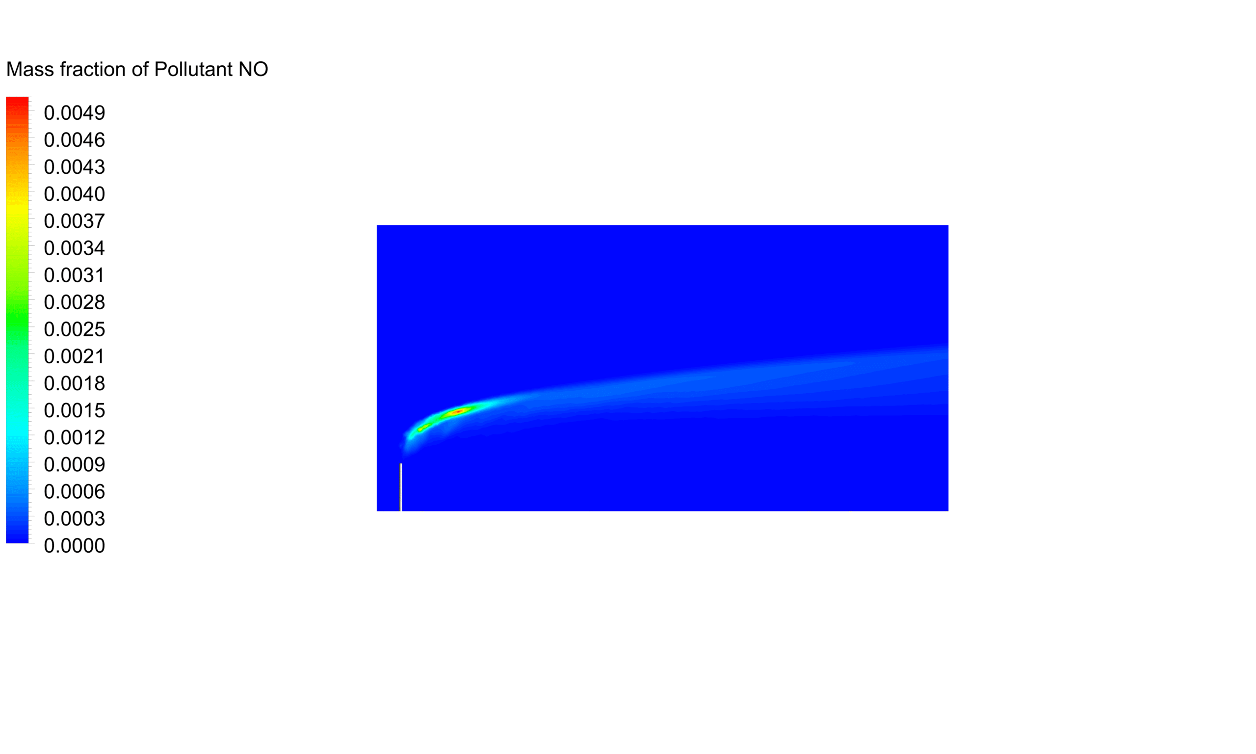 - NO Formation: Contours of NO mass fraction within the flare system and the surrounding atmosphere show that the high temperature regions inside the flare chamber and at the flare tip are conducive to thermal NO formation via the oxidation of atmospheric nitrogen. The simulation results highlight areas with elevated NO concentrations, allowing for the identification of potential hotspots.
