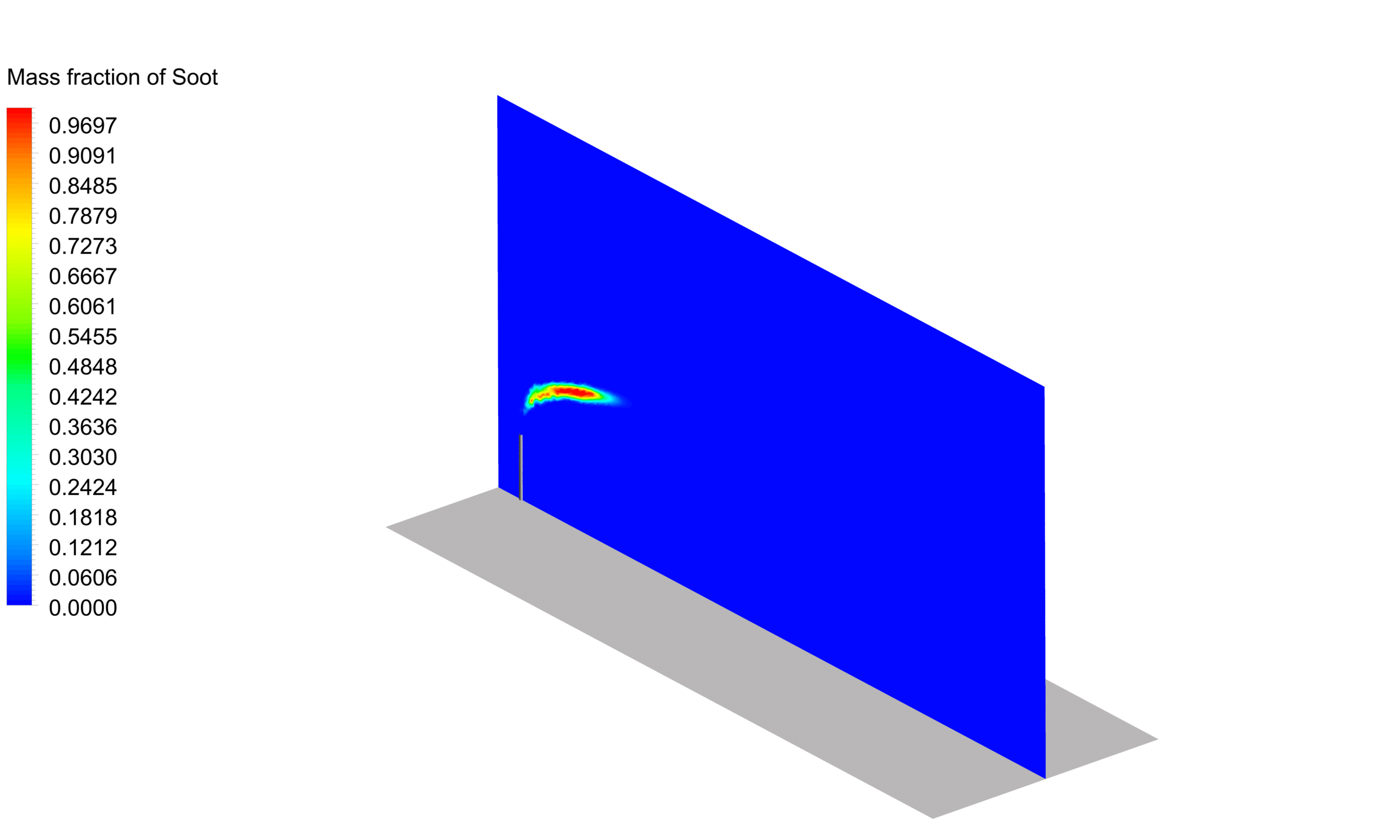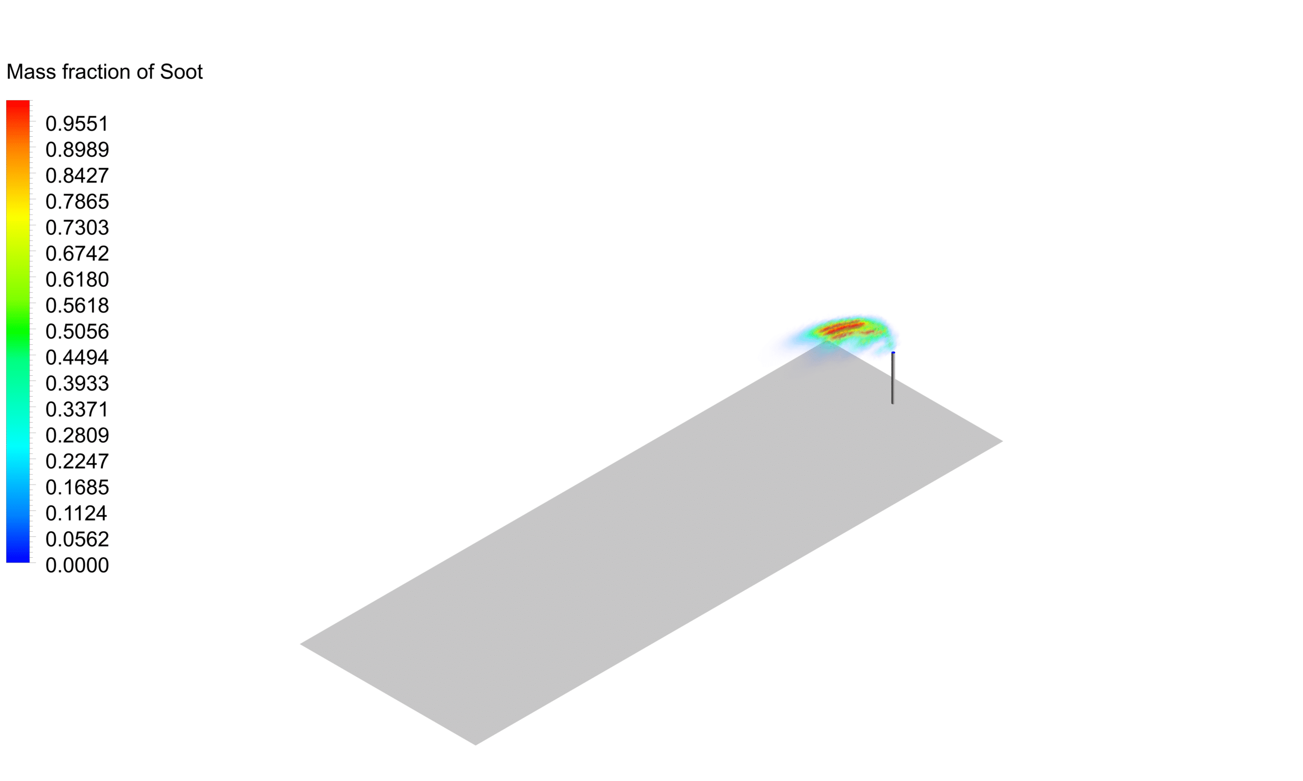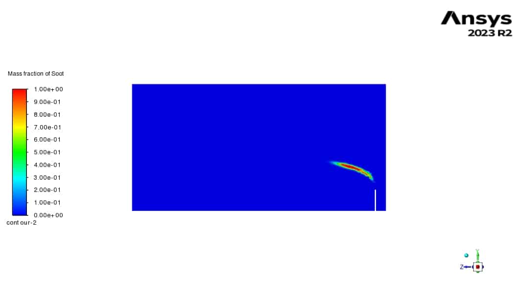 - Soot Formation: Soot particles are generated due to incomplete combustion and fuel-rich conditions(shown in contours of soot mass fraction). The contour plots reveal regions where soot formation is likely to occur, such as in the flare chamber and the initial plume region.