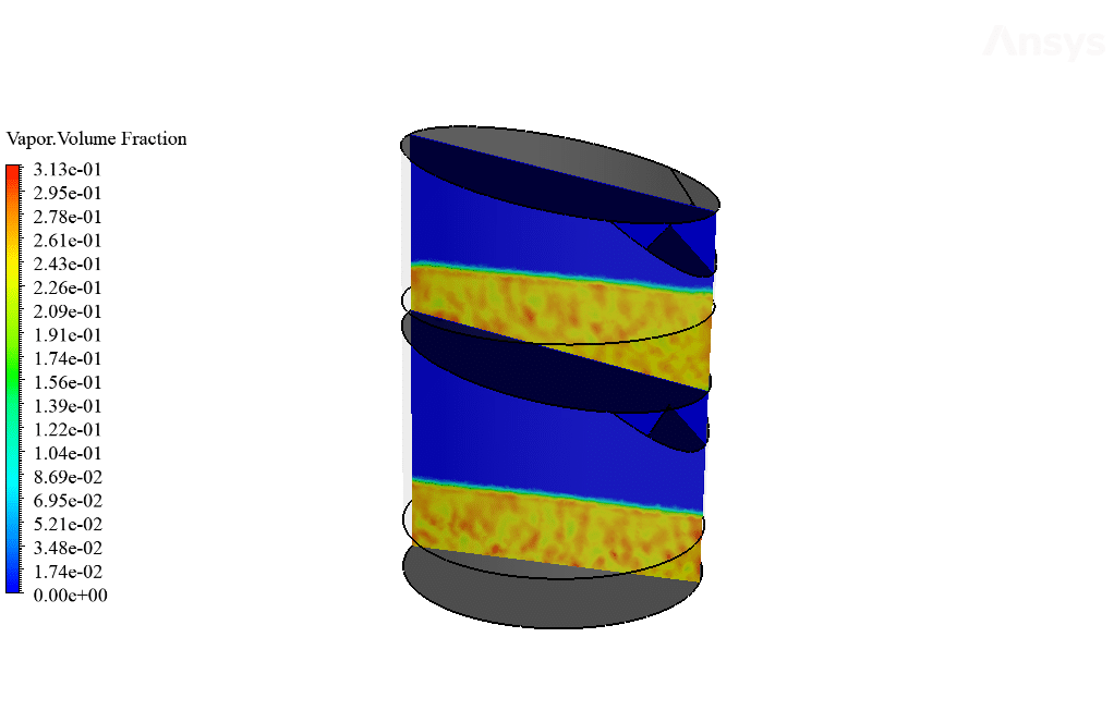 Furthermore, a realizable k-epsilon model is used to solve turbulent fluid equations. This model provides higher accuracy when simulating internal flows. The energy equation is also enabled due to the fact that we have heat transfer in this model. The present study is performed in transient format and 3D. Moreover, gravity is enabled to capture the upward motion of vapor due to its lesser density than water liquid.