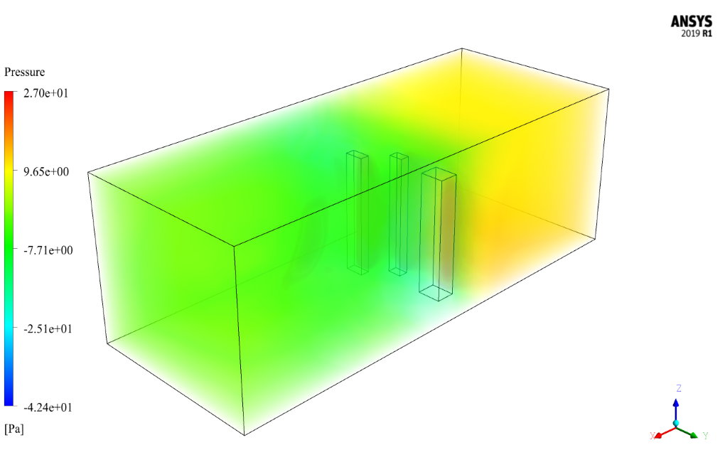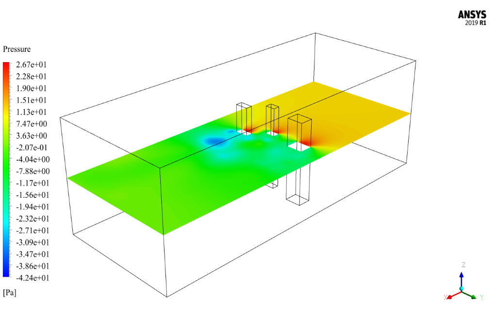 At the end of the solution process, based on the contour related to pressure, the maximum pressure happens when the wind flow collides with the front sides of the buildings.