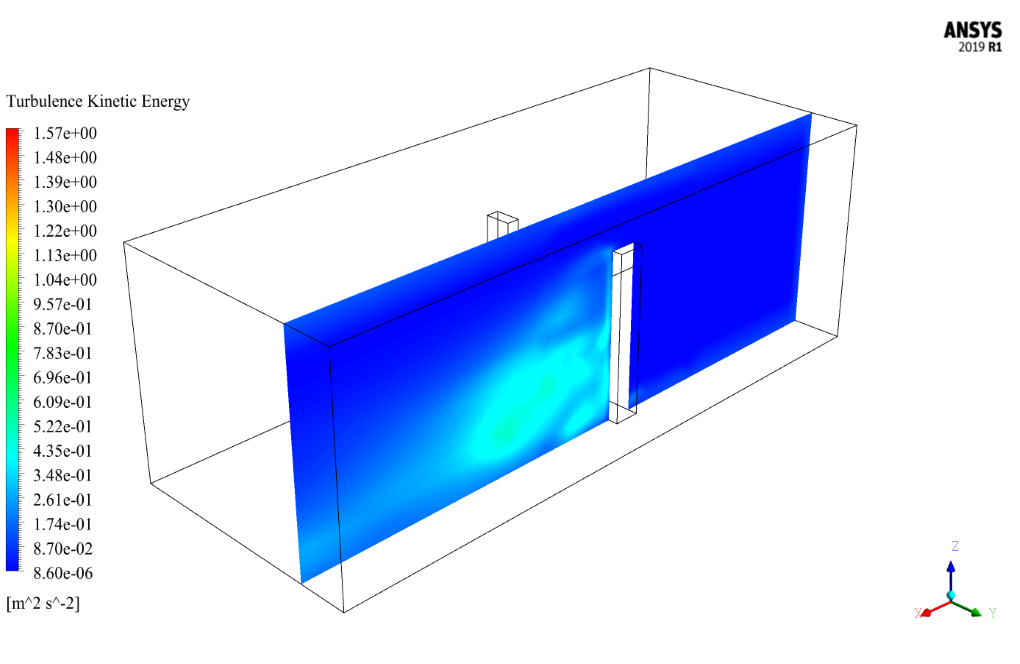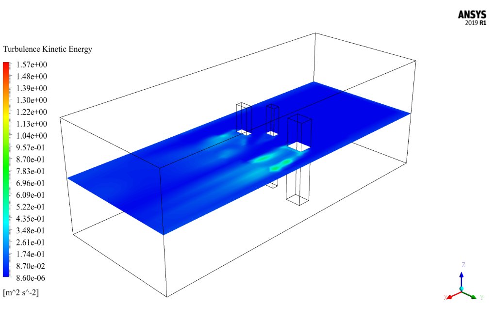 Also, from the velocity contours, it is visible that the vortex occurs on the backward faces of the buildings. Turbulence kinetic energy, pathlines, and vectors are also extracted and analyzed. All contours, pathlines, and velocity vectors are obtained in the final second of the solution process, after 1s.