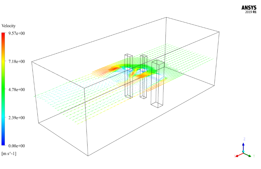 In the present case, the wind flow around the three buildings is considered where the airflow enters it horizontally at a speed of 5 m/s and hits the buildings. This study investigates airflow behavior around buildings after colliding with them and studies the vortex phenomena behind these buildings.