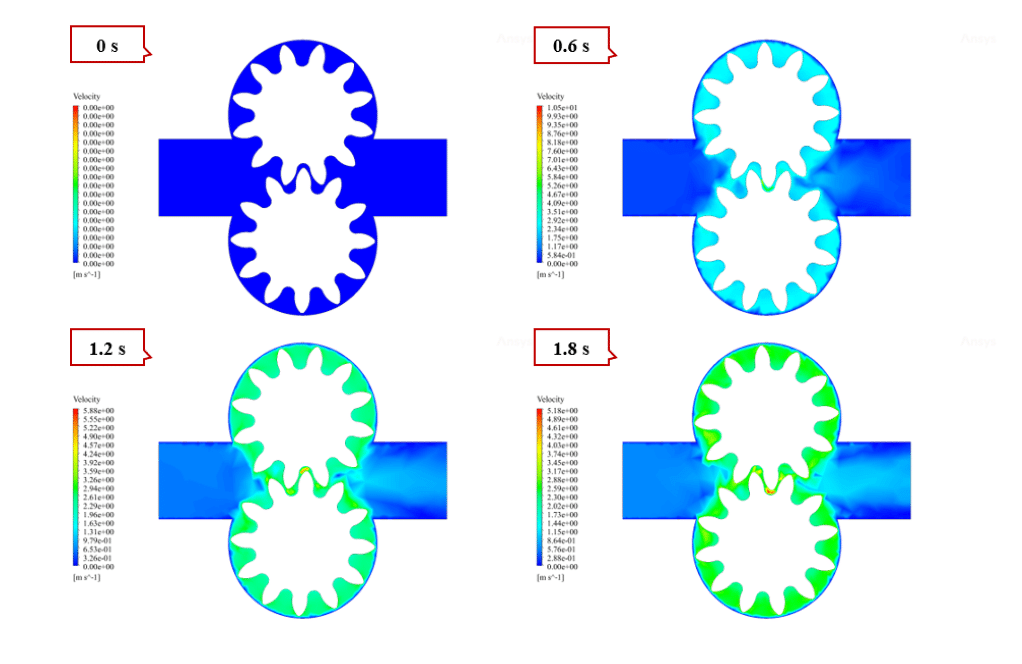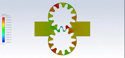 After the solution, we obtained pressure and velocity contours. Because the gears rotate over time, we obtained the animation of the velocity and pressure contours.