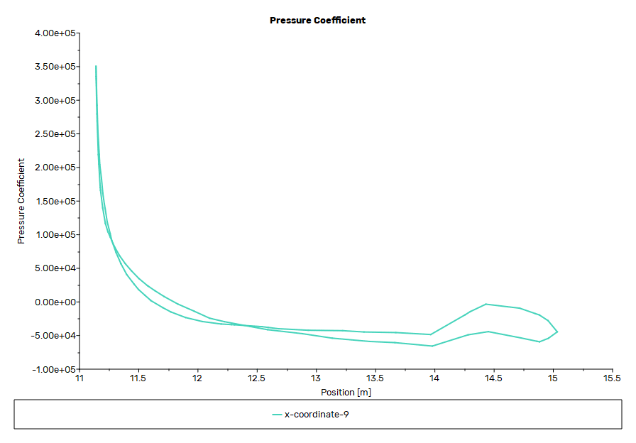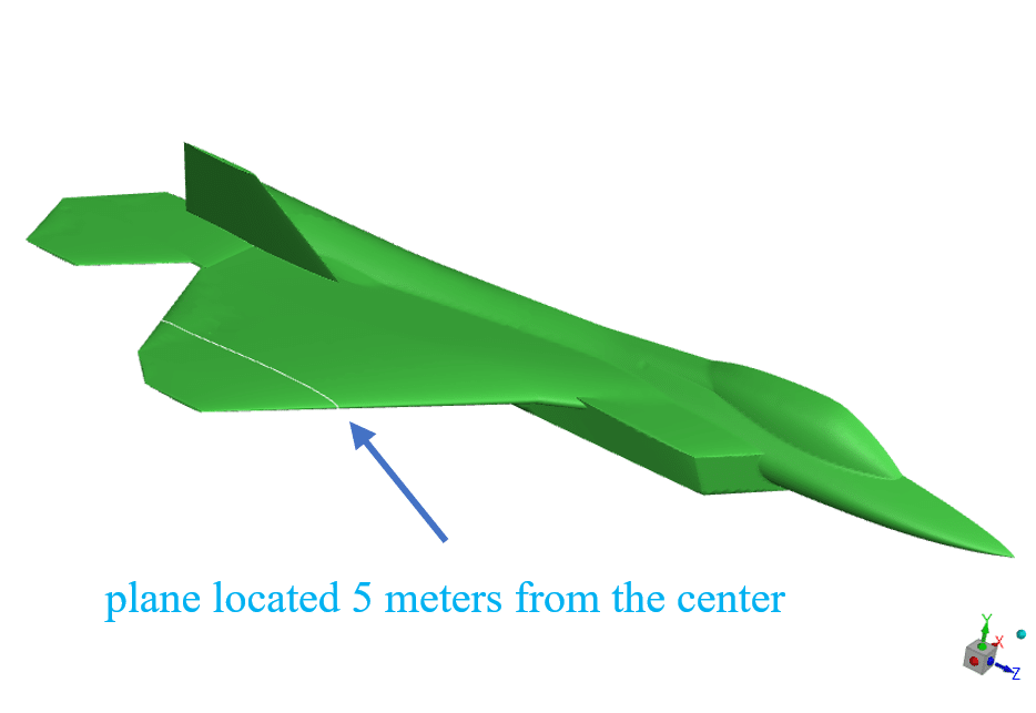 The pressure coefficient plot is displayed on a plane located 5 meters from the center of the aircraft, as indicated by the blue arrow. The pressure coefficient is a dimensionless quantity that represents the relative pressure distribution. The plot shows the variation of the pressure coefficient along the plane. Positive values indicate regions of high pressure, while negative values represent regions of low pressure relative to the freestream conditions.