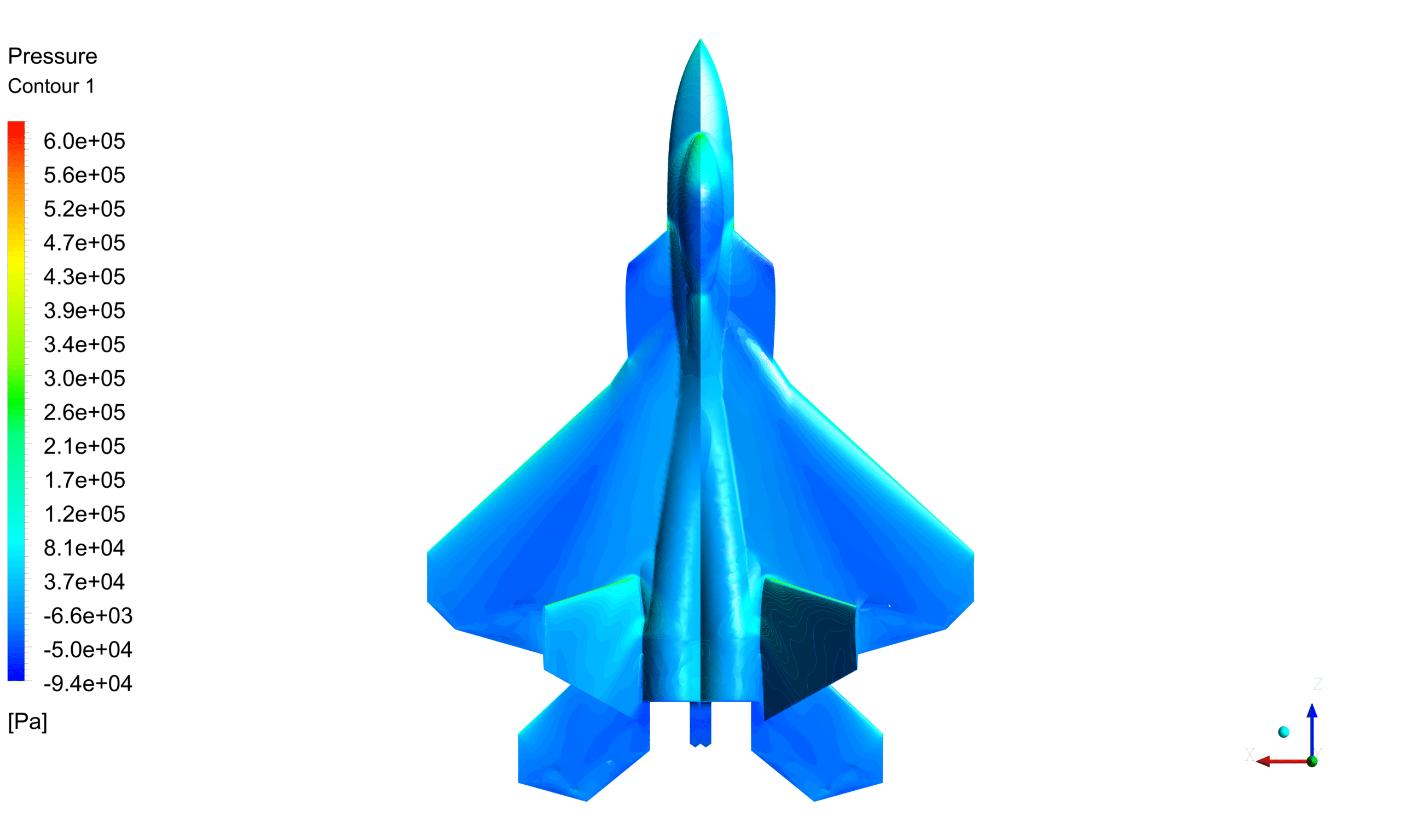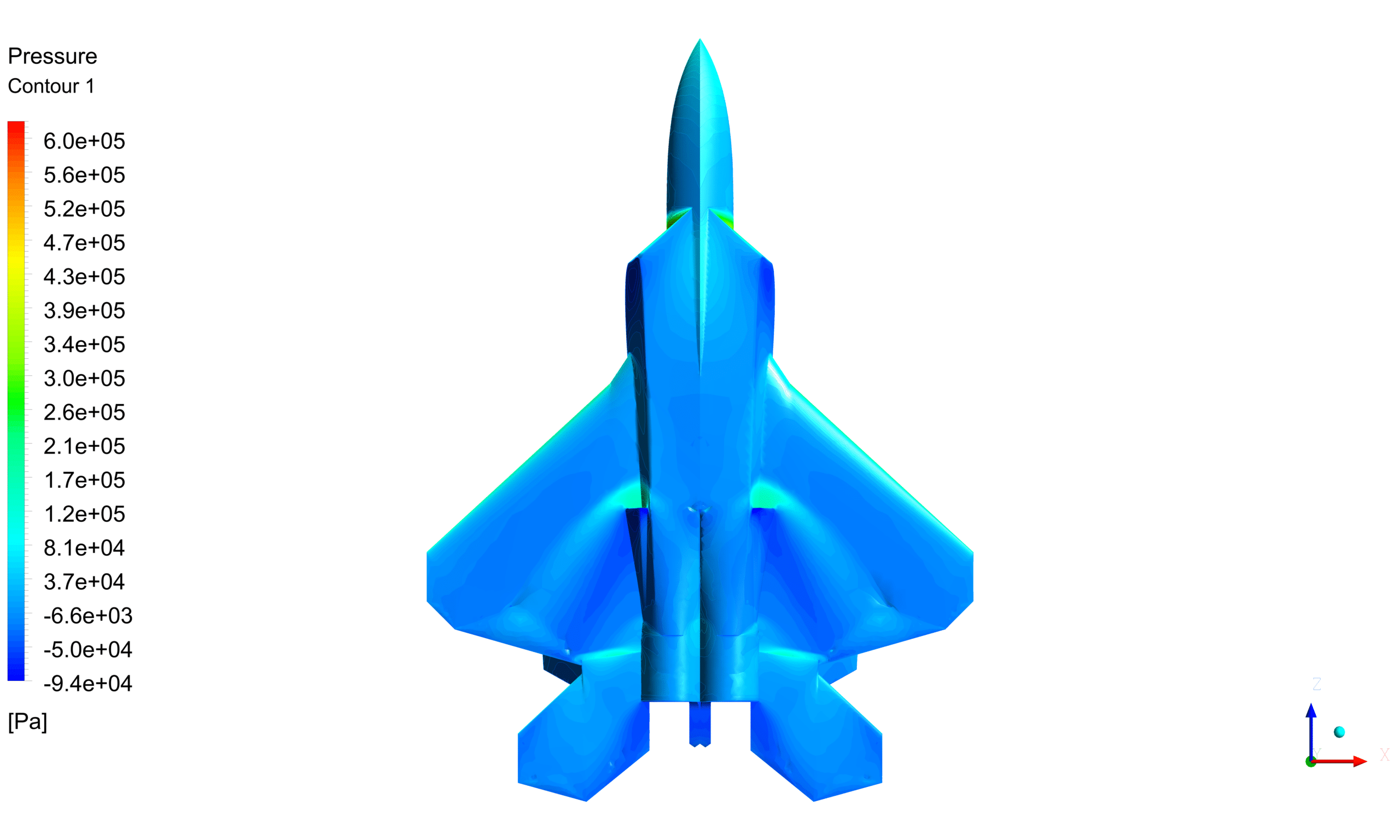 The pressure contour plot illustrates the pressure distribution around the F-22 aircraft. Higher pressure regions can be seen at the wings’ leading edges and nose, while lower pressure regions are visible on the upper surfaces of the wings and tail.