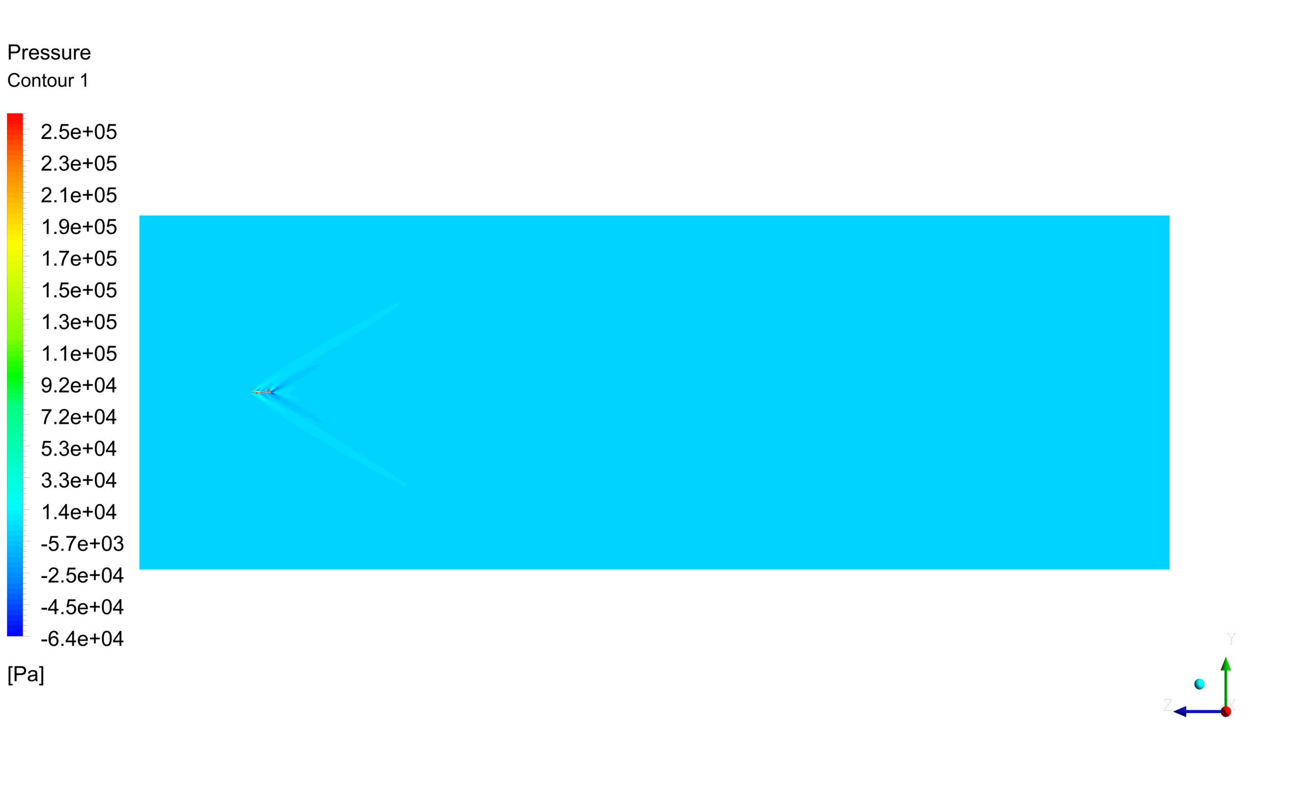 The boundary condition on the aircraft surface was set as a wall, while the remaining boundary conditions were set as pressure far-field with a Mach number of 2. The SIMPLE algorithm was used, and the explicit formulation was employed. The standard initialization method was utilized, and the turbulence model was set to k-ε Realizable. The working fluid was assumed to be an ideal gas (air).
