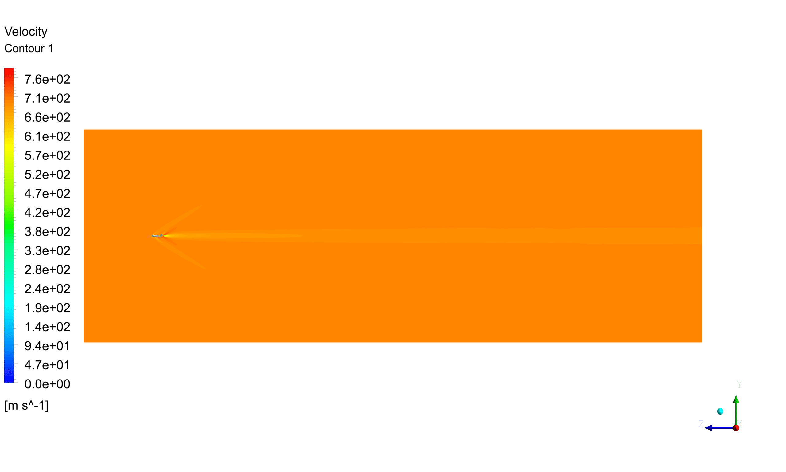 Therefore, the simulation has an error of approximately 5.04% compared to the actual thrust force of the F-22 engine. Velocity Contour (Fig. 3): The velocity contour plot shows the distribution of velocity magnitude around the F-22 aircraft. Higher velocities can be observed in the regions surrounding the aircraft, especially near the wings and tail.