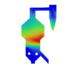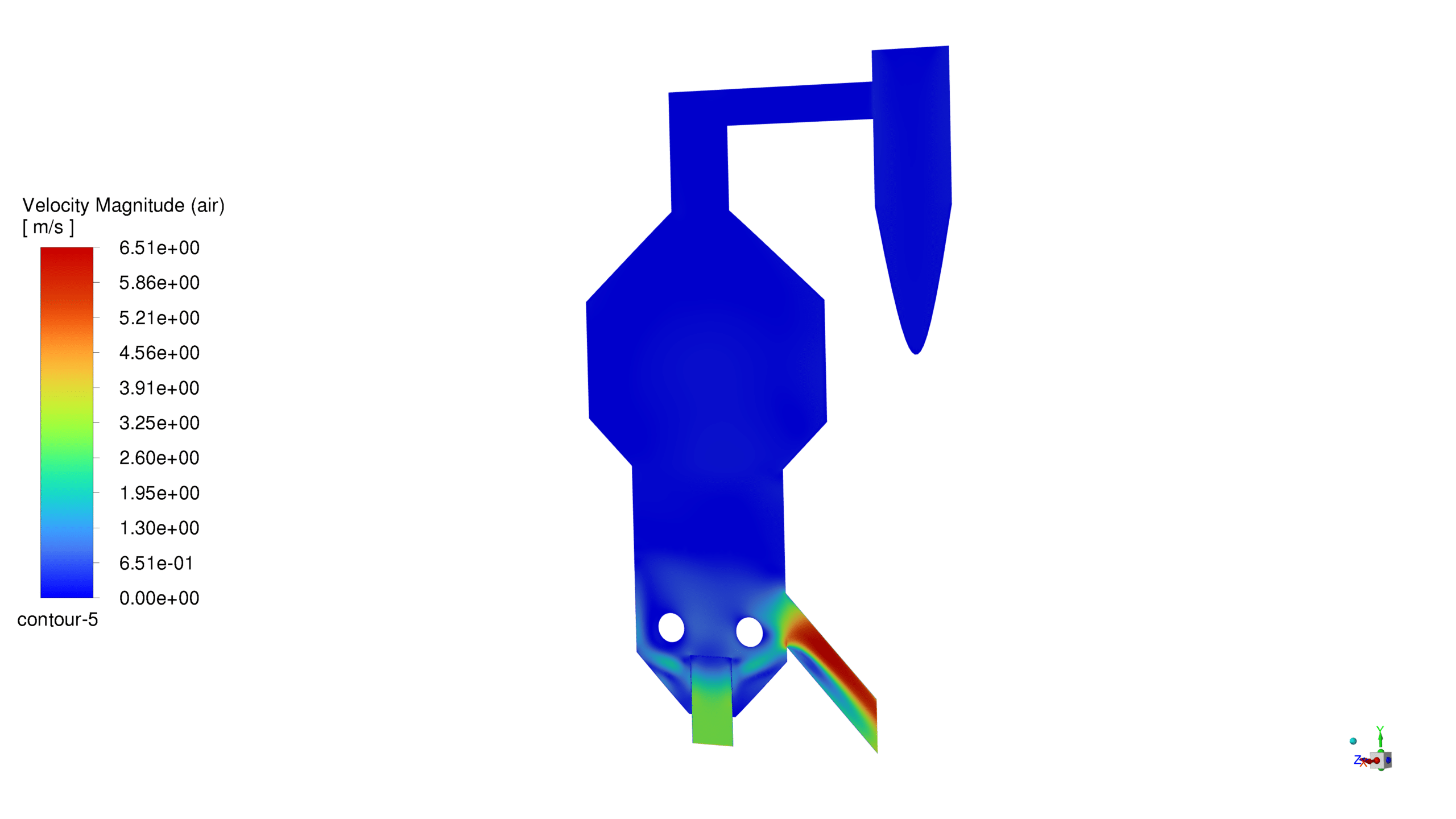The velocity magnitude reaches a maximum of 6.51 m/s, with higher velocities particularly noticeable in the riser section. This velocity profile ensures adequate particle suspension and promotes efficient contact between the catalyst and feedstock. The flow pattern indicates good mixing characteristics and appropriate reaction residence time.