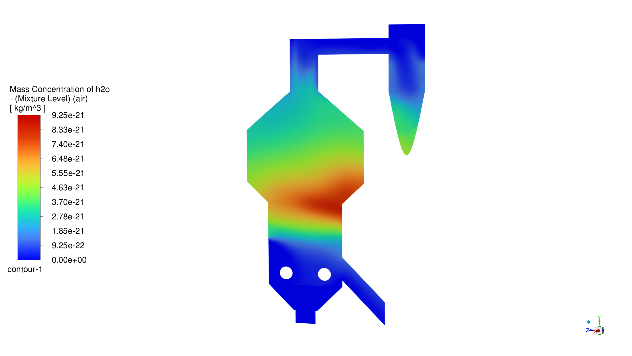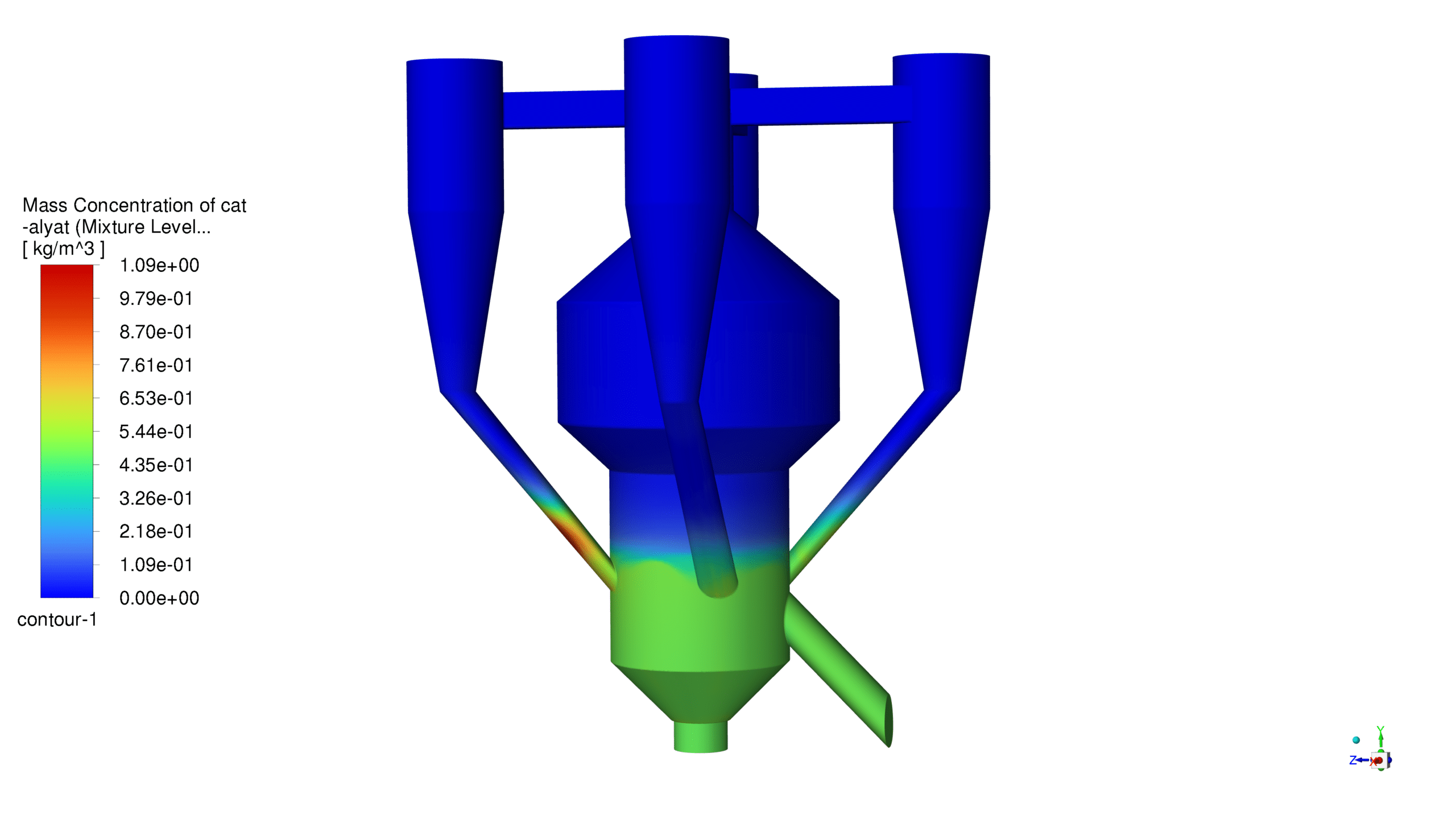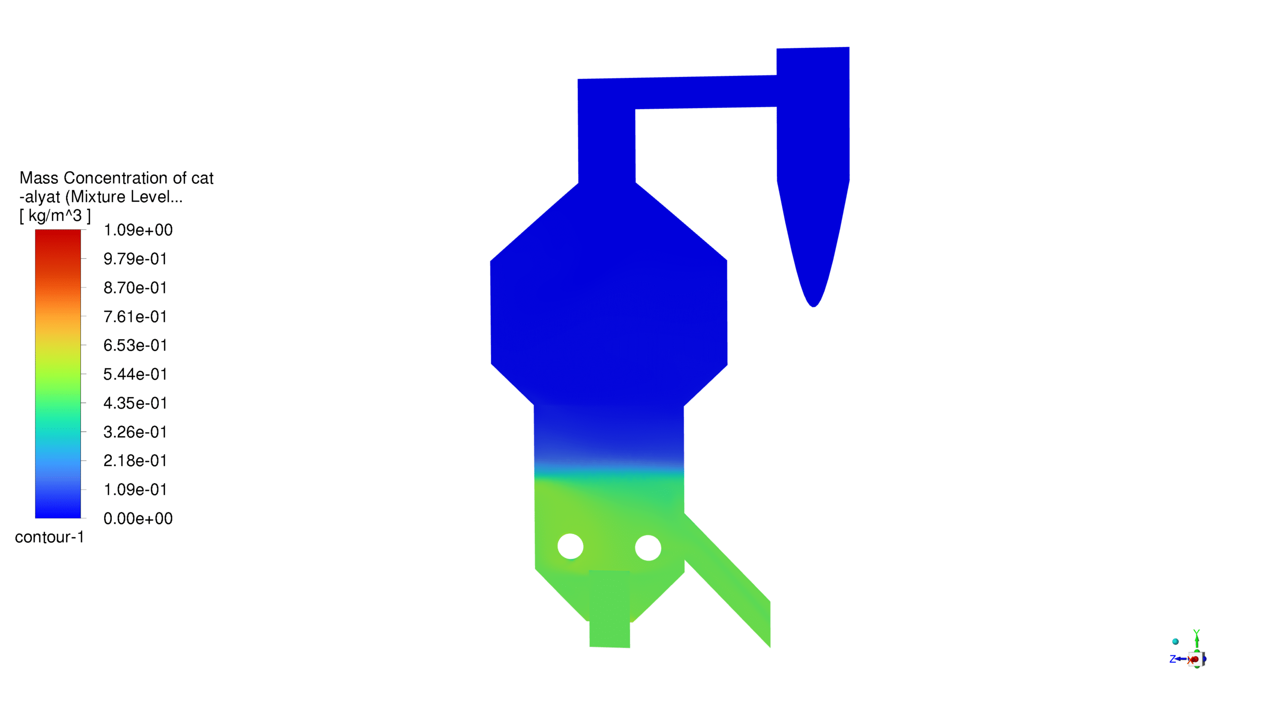 The catalyst mass fraction shows a well-distributed pattern, with higher concentrations in the lower regions gradually decreasing upward. This distribution pattern confirms adequate catalyst circulation and utilization throughout the reactor volume. The results validate the reactor’s design for optimal catalyst-feedstock contact and reaction efficiency.