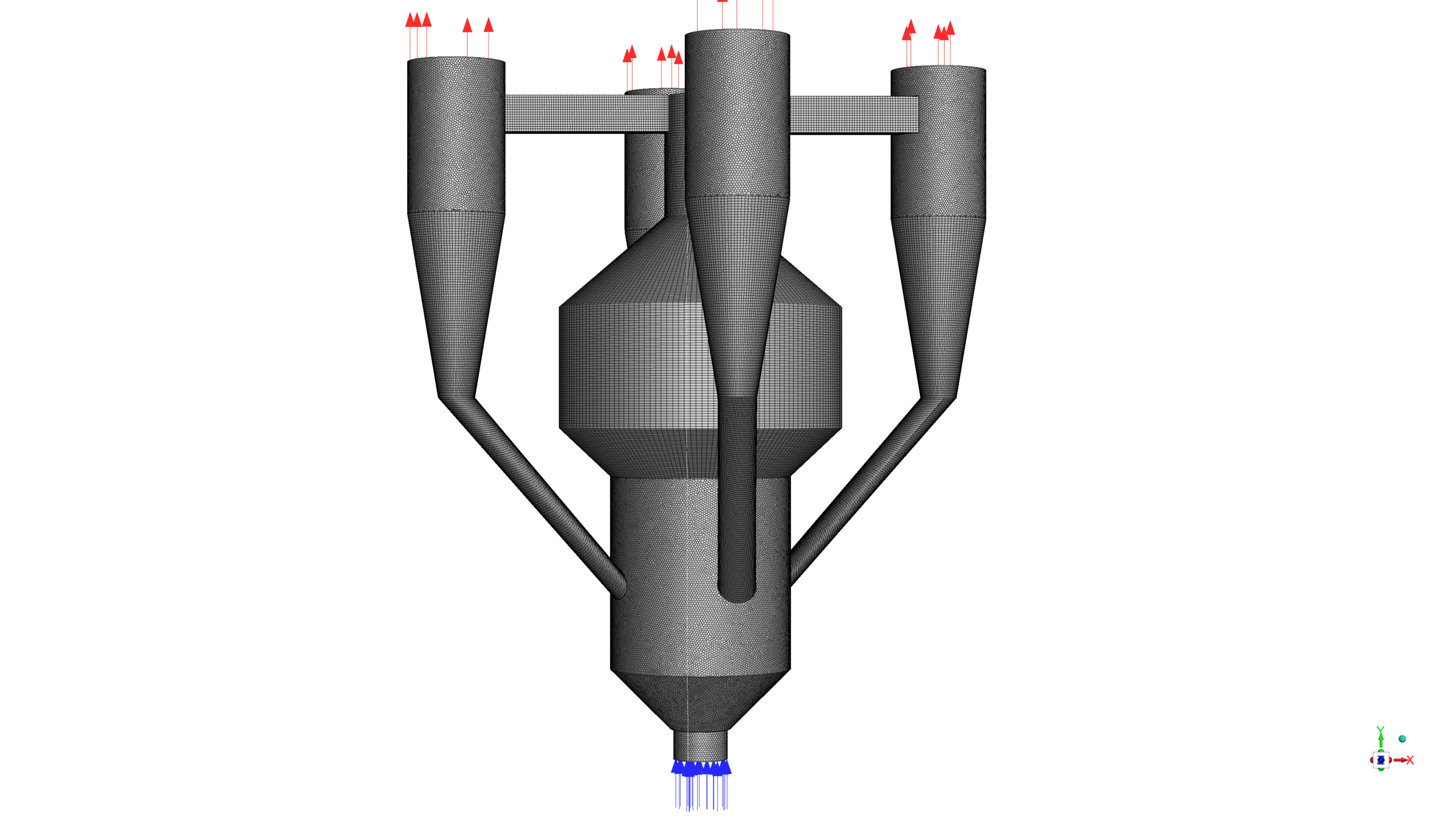 The 3-D geometry of the present model is carried out using space claim software. The geometry consists of a coke inlet, air inlet, gas outlet, and catalyst outlet. The meshing of this present model has been generated by ANSYS Meshing software. The mesh grid is unstructured, and the total cell number is 1,361,360.